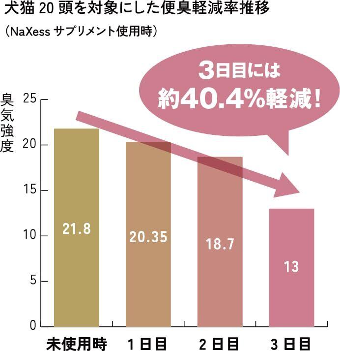最短2日で排泄物の臭いを40%軽減、独自のナノ型乳酸菌と有胞子性乳酸菌が腸内までしっかり届き、臭いの原因を根本から抑えます