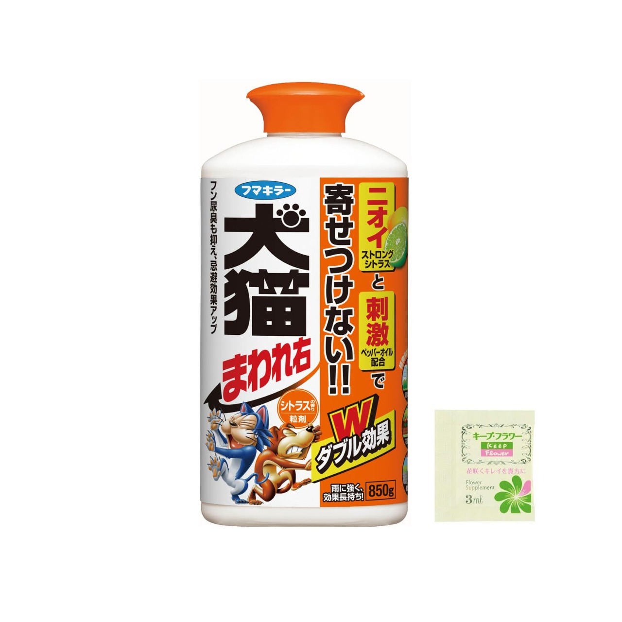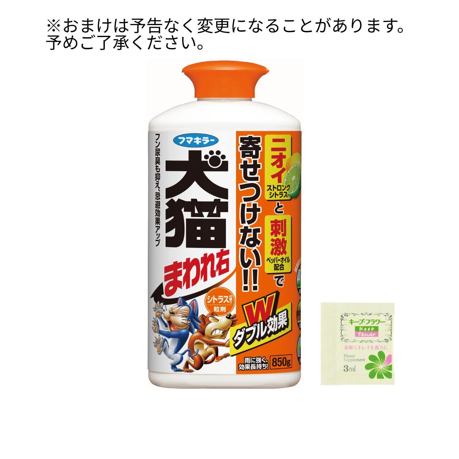 忌避成分:香料・ペッパーオイル・サリチル酸メチル 犬猫の嫌がるニオイとオイルの刺激のダブル効果 天然消臭成分配合 仕様:おまけ付き(切り花延命剤)※おまけ商品は内容が変更となる場合がございます。