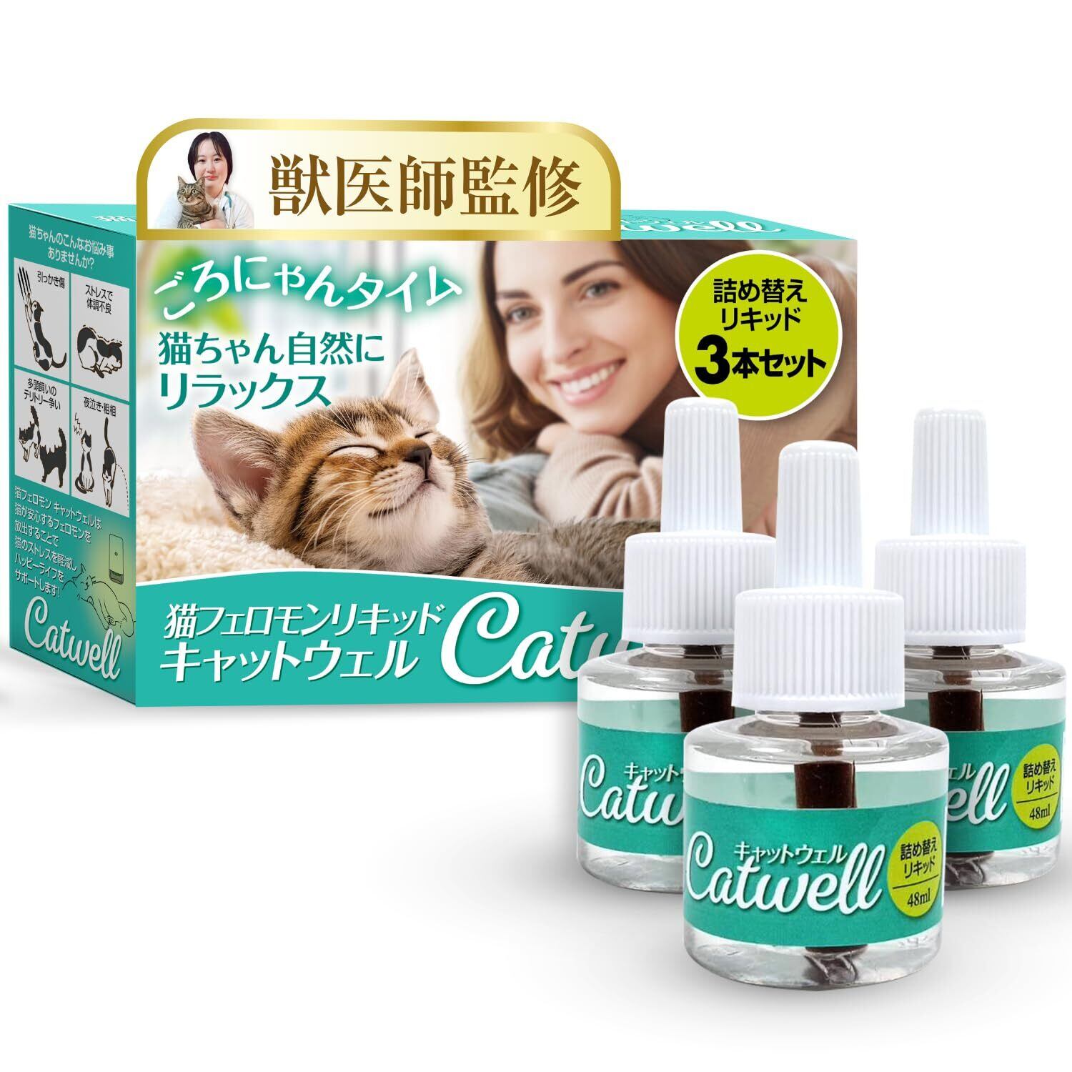 キャットウェル 猫用フェロモン 詰め替え用リキッド 3本セット 獣医師監修 ストレスと不安を軽減 (48mL x 3本) 90日分