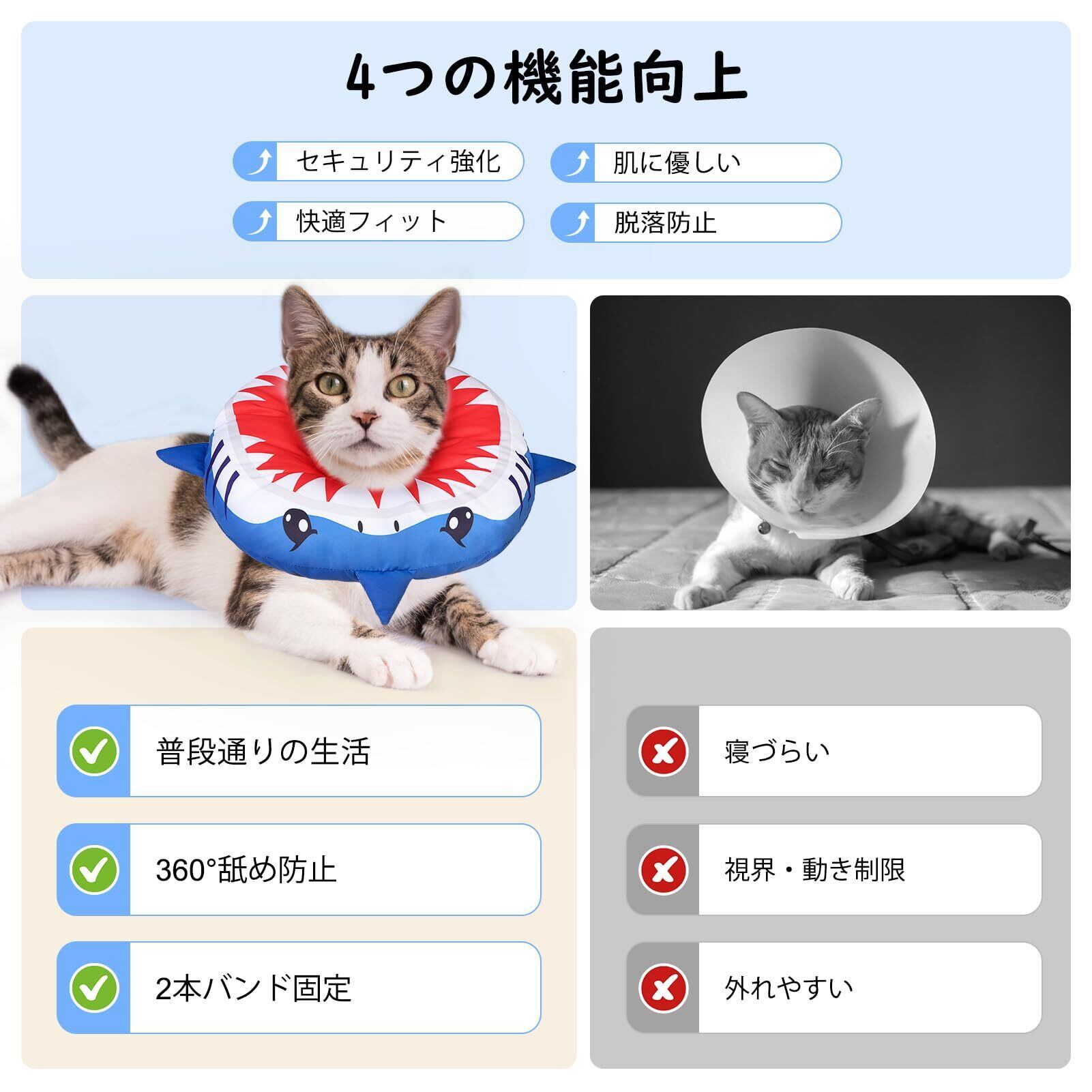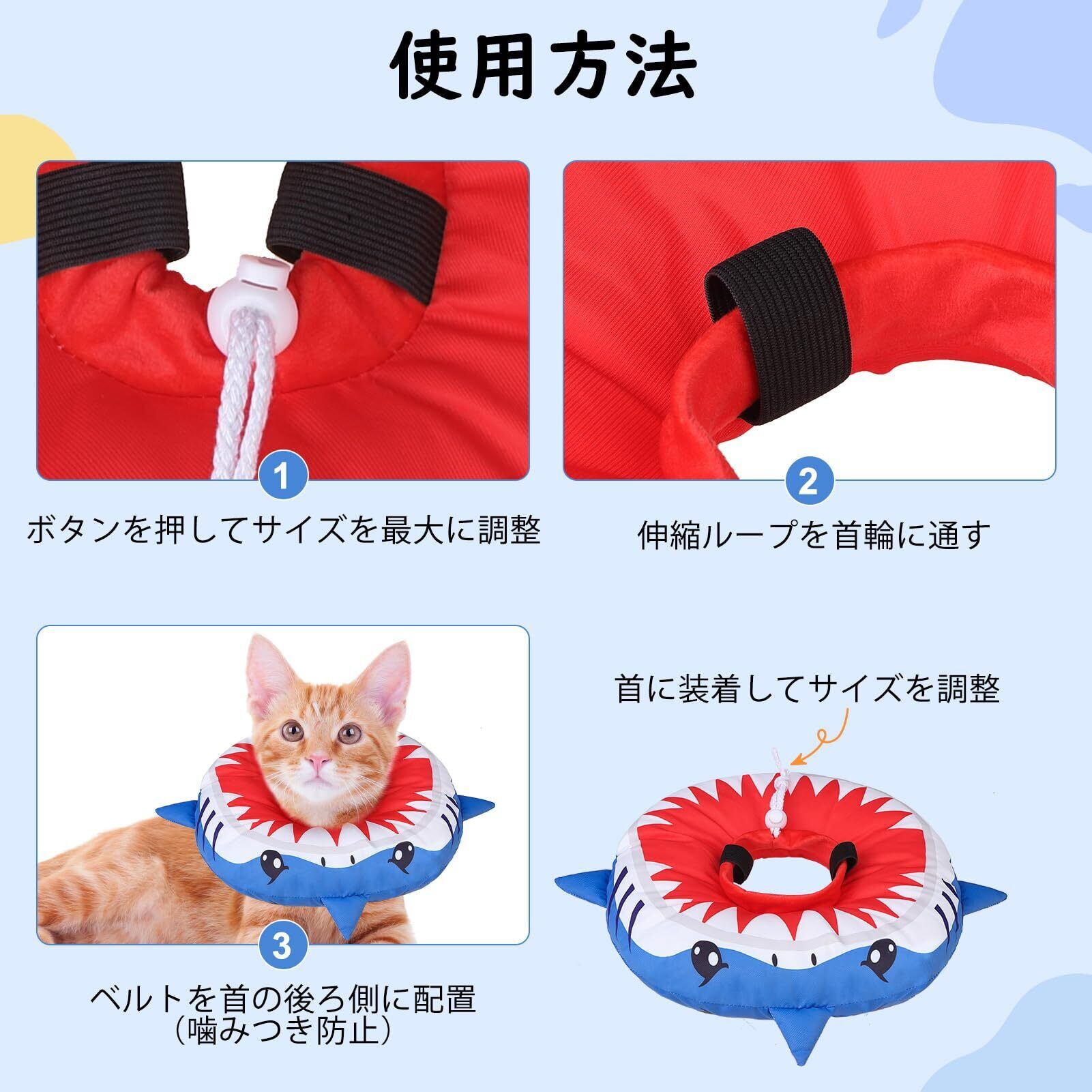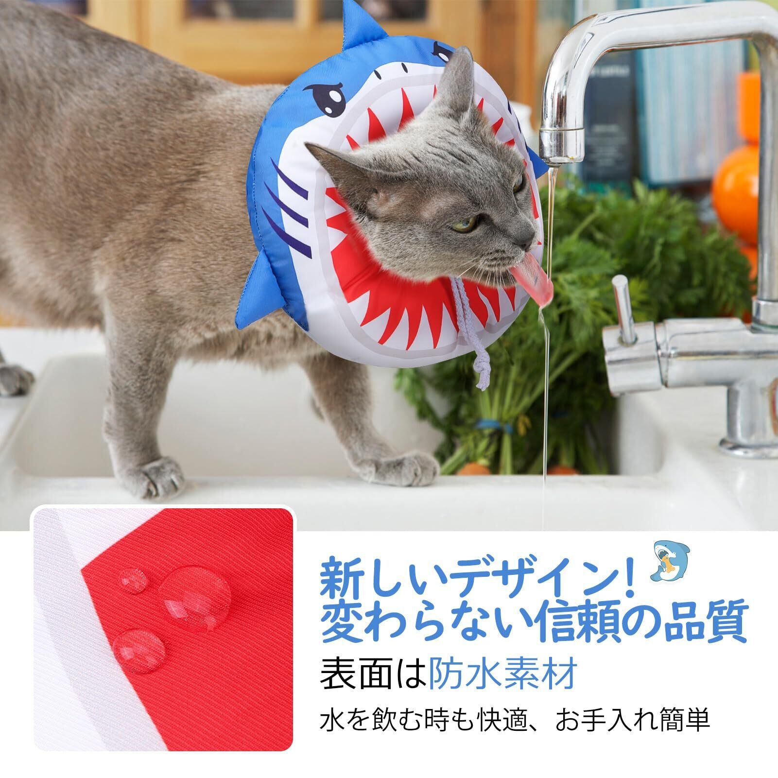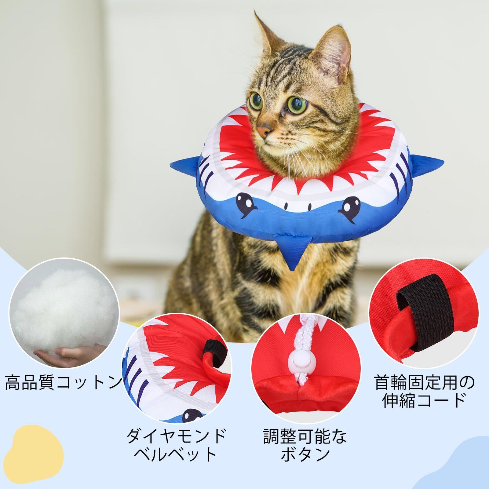 BEAUTYZOO エリザベスカラー 猫用 小型犬用 ソフト 軽量 防水 術後 傷口保護 舐め防止 引っ掻き防止 視界や飲食を妨げない かわいいドーナツ型 調節可能、サメ M