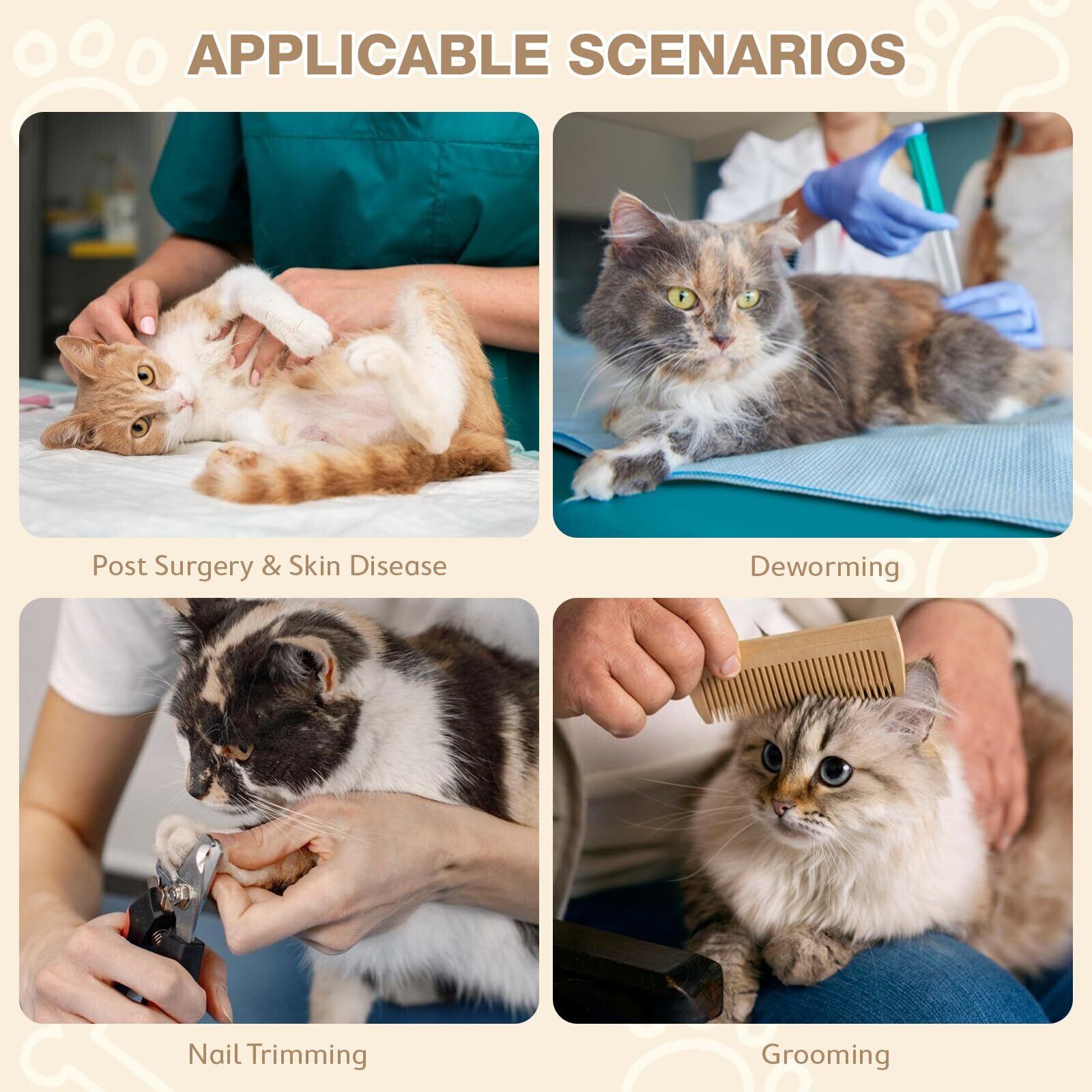 多用途に使える安心設計:手術後・皮膚病・爪切り・薬塗布など様々な場面で活躍。ペットの状態に合わせてご使用可能