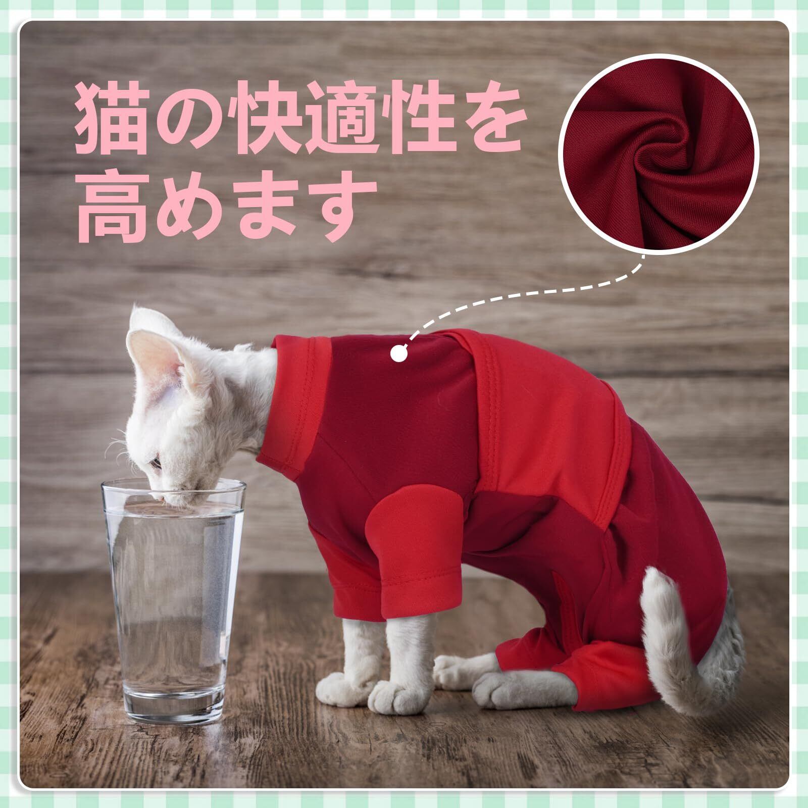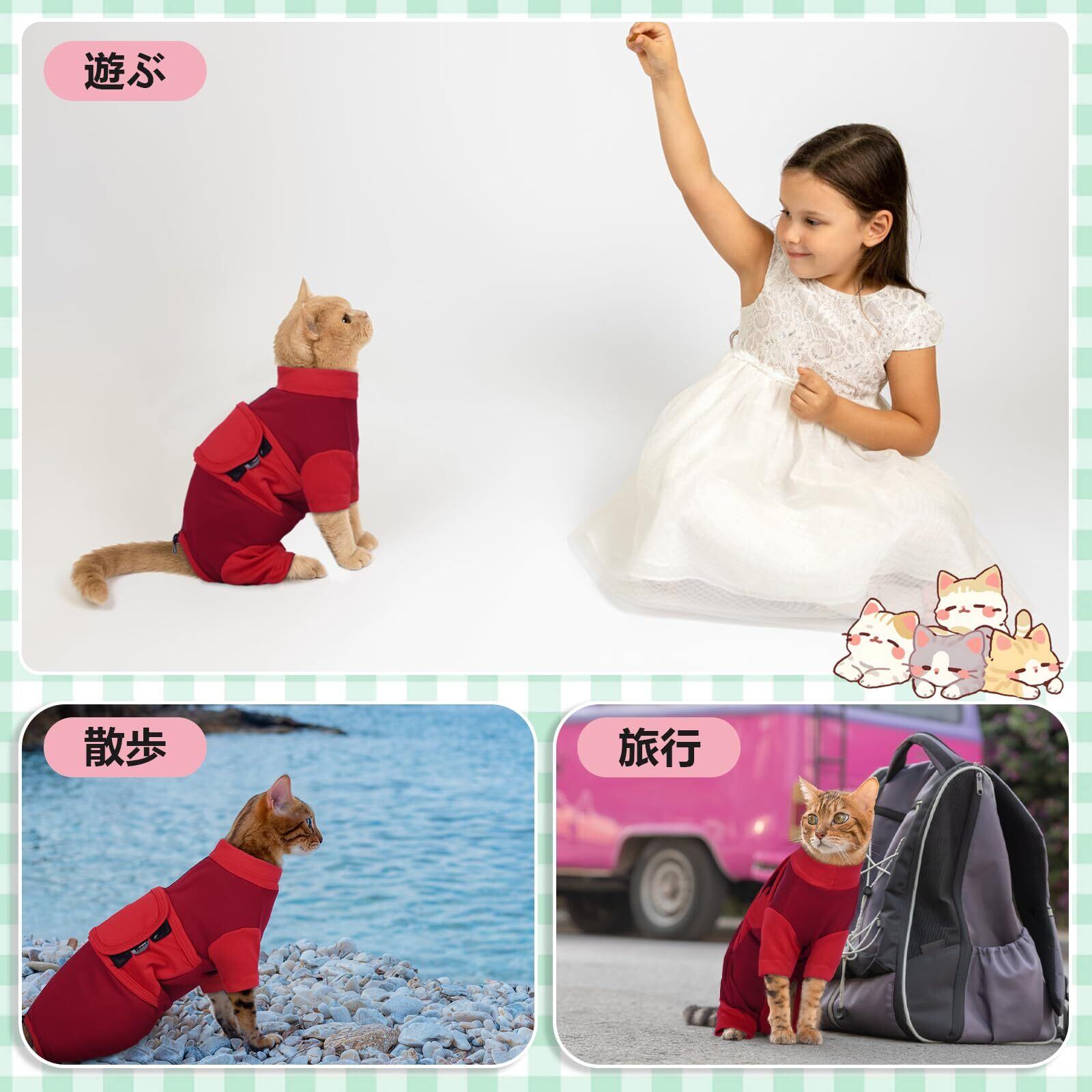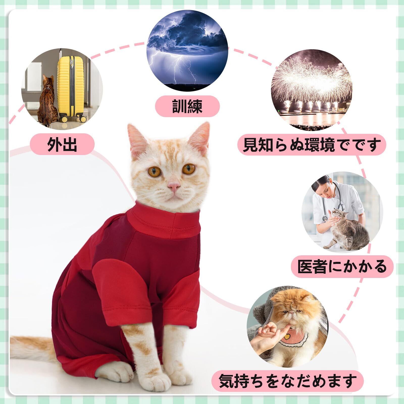 【多様な使用シーン】猫のホームウェアとして使用でき、猫の皮膚や傷を保護し、舐めたり掻いたりするのを防ぎ、手術後のケアなどにも使えます