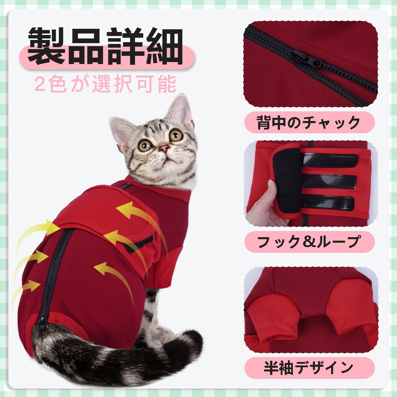 背中のファスナーと面ファスナー設計で、猫に楽に着せたり脱がせたりでき、猫に不快感を与えません