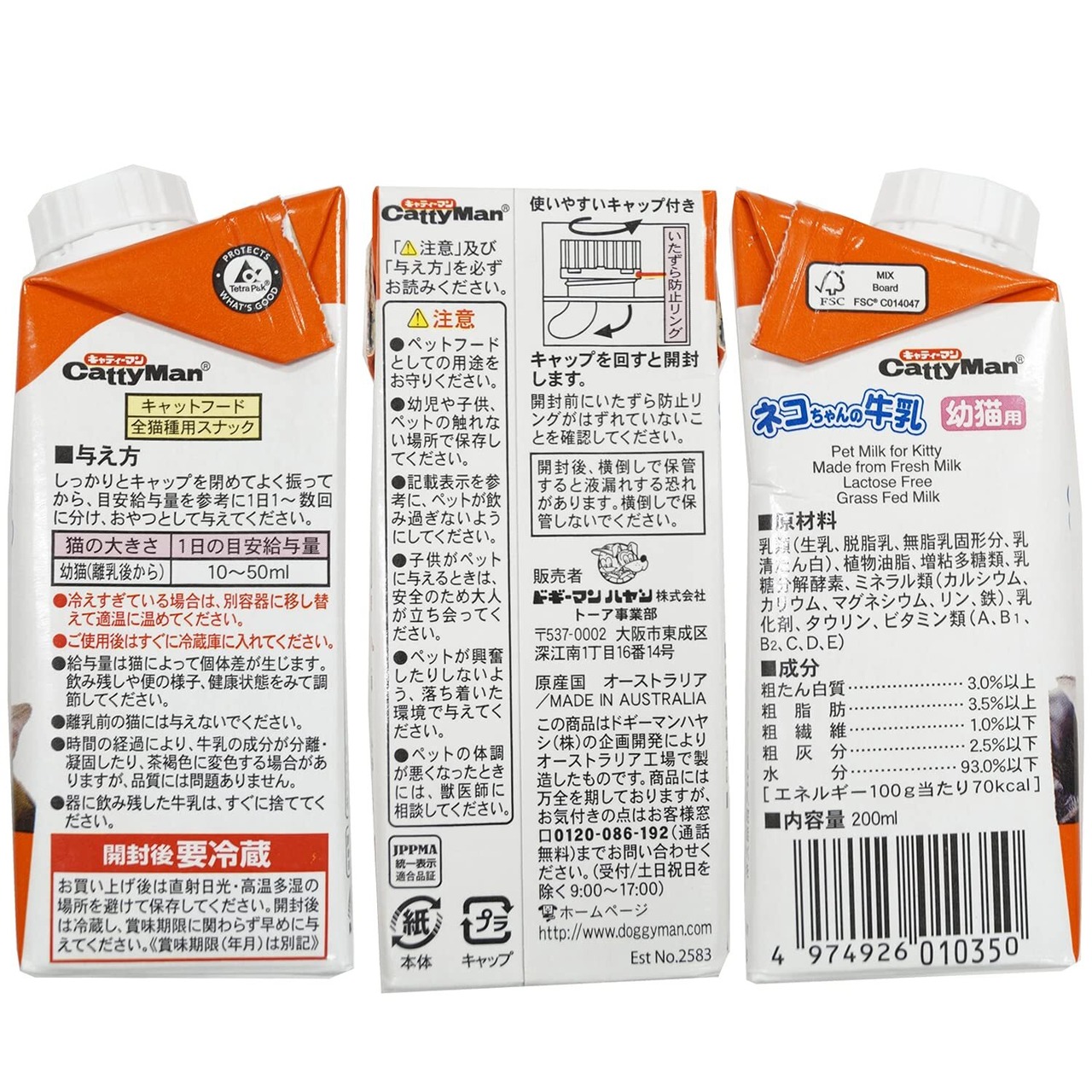 オーストラリア産の生乳から作った、生乳そのままの風味が生きている幼猫用の牛乳です。おなかにやさしい乳糖ゼロ。製造過程で乳糖を完全分解しました。人口着色料や香料、防腐剤を使用せず、生乳の旨さを最大限引き出しています。ビタミン、ミネラル、カルシウム、そして食物からの摂取が頼りの必須栄養素タウリン配合。幼猫の健全な生活をサポートします。成長が著しい幼猫向けに成分調整した毎日おいしく与えられる牛乳です。 使用上の注意 パッケージ記載の「注意」及び「与え方」を必ずお読みください。 原材料・成分 【原材料】乳類(生乳、脱脂乳、無脂乳固形分、乳清たん白)、植物油脂、増粘多糖類、乳糖分解酵素、ミネラル類(カルシウム、カリウム、マグネシウム、リン、鉄)、乳化剤、タウリン、ビタミン類(A、B1、B2、C、D、E) 【成分】成分/粗たん白質:3%以上、粗脂肪:3.5%以上、粗繊維:1%以下、粗灰分:2.5%以下、水分:93%以下 エネルギー/70kcal/100g 使用方法 目安給与量を参考に1日1~数回に分け、おやつとして与えてください。 続きを見る