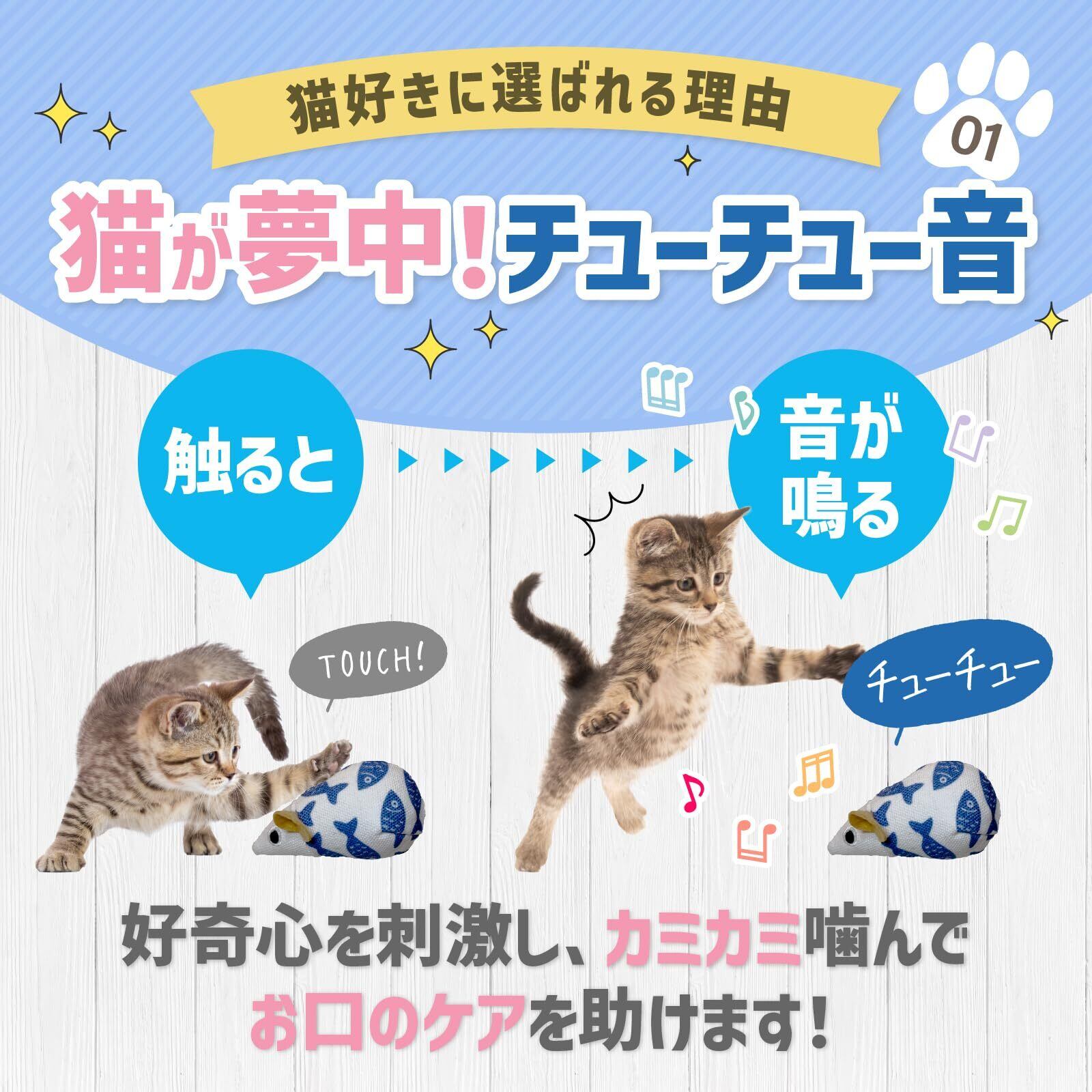 【猫ちゃん大興奮】触れるとチューチューと鳴るねずみのおもちゃは、猫おもちゃランキングでも上位にランクイン。音で猫の狩猟本能を刺激し、一人遊びでも楽しめる自動玩具です。ねずみのけりぐるみとしても、興味を持たなかった猫にも効果的です。