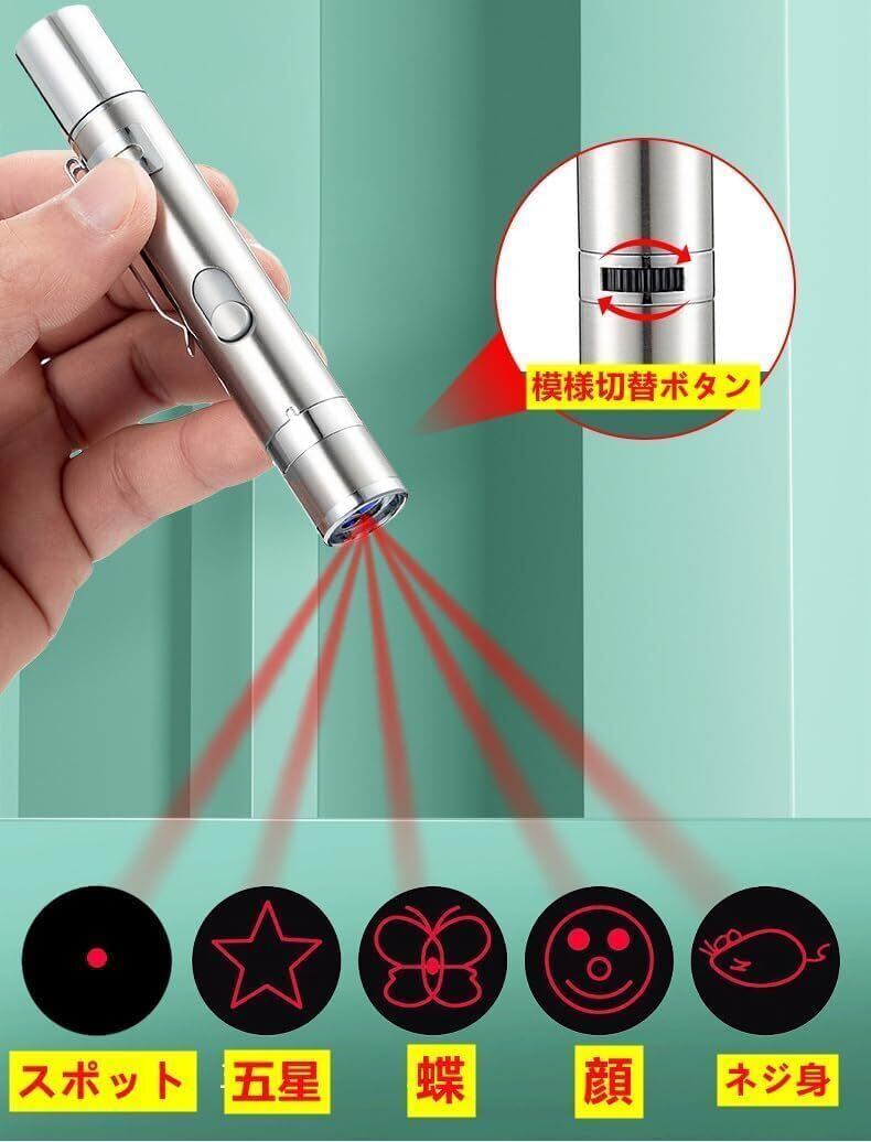 猫 おもちゃ 7in1多機能 LEDライト 猫遊び用品 LED USB充電式パターンライト ストレス解消 運動不足解消 ネコ おもちゃ 猫チェイサーのためのアイデアギフトトレーニングツール (ペン型 シルバー)