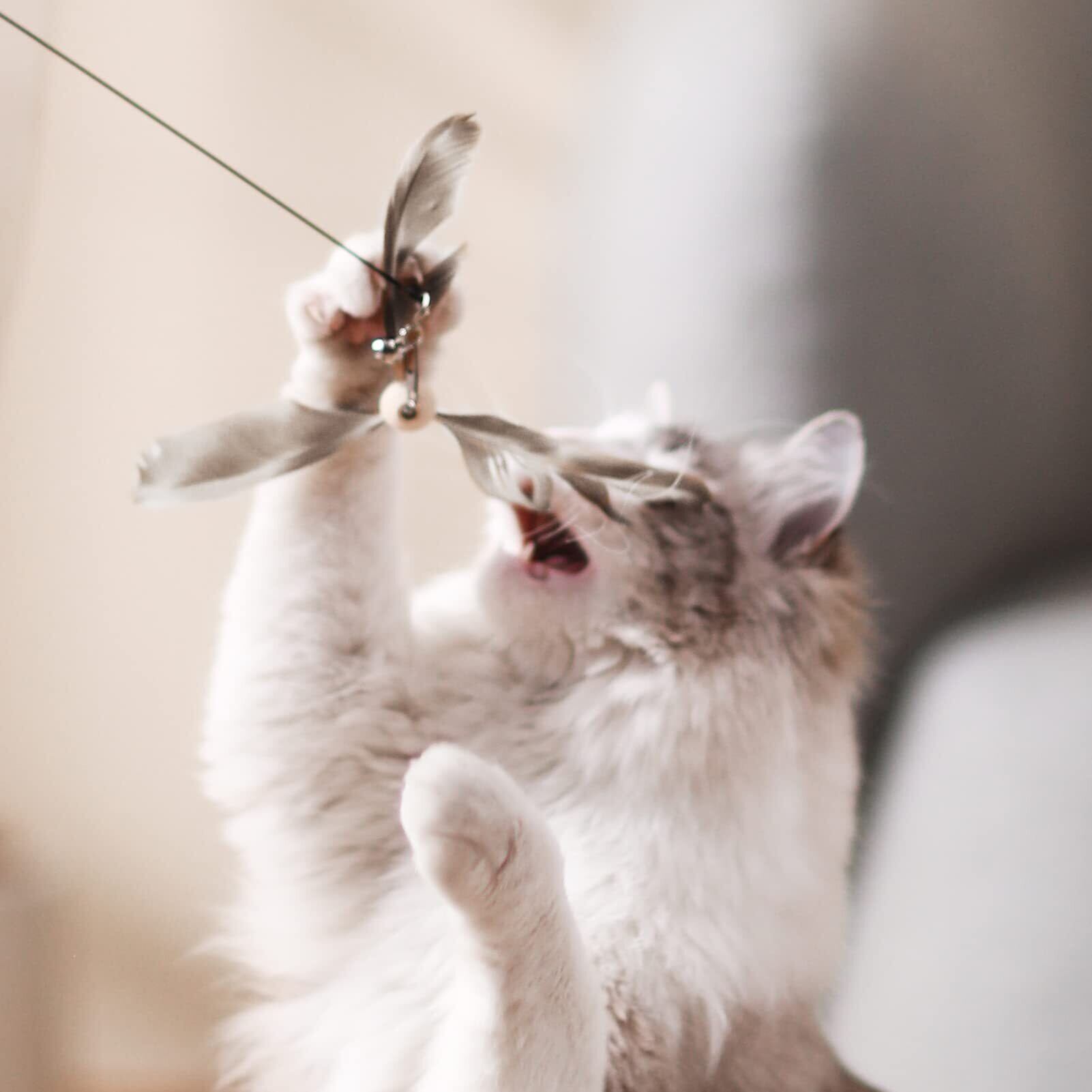 我慢できないねこじゃらしー長い針金を使ったねこじゃらしなので、より簡単に動かすことが出来ます。また、実際の鳥の動きに似せるため羽毛をプロペラ型に取り付けており、それと一緒に鈴の音もなることで、より猫ちゃんの注意を引き付けることが出来ます。