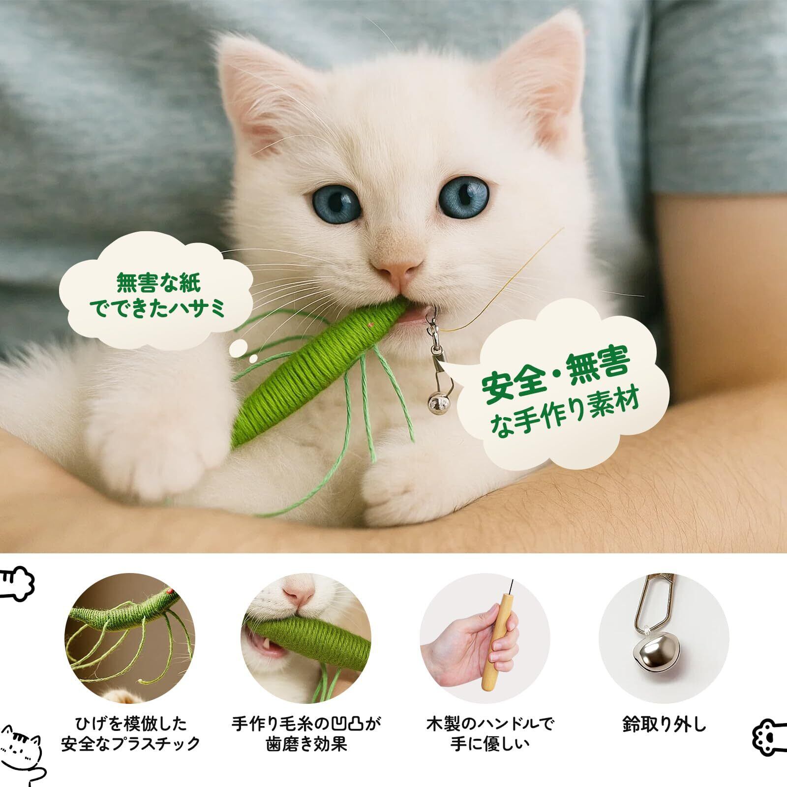 【安全な素材選ぶねこじゃらし】ハサミ部分には無害な紙、ヒゲ部分には無毒のプラスチックを使用し、万が一噛んだり舐めたりしても安心。猫用おもちゃは化学添加物を使わない優しい設計で、猫の健康にも配慮します。