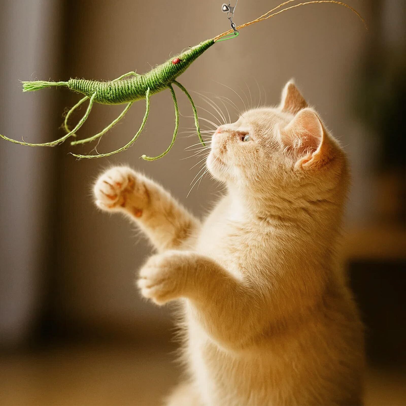 【遊び心満載の「若草色バッタ」デザイン】ふわっと動く柔らかいエビのボディは、ねじったり跳ねたりと、まるで生きているかのような動きを再現。揺れるヒゲやチリンと鳴る鈴の音が、猫の狩猟本能をくすぐる猫玩具として、夢中で追いかけたくなる。