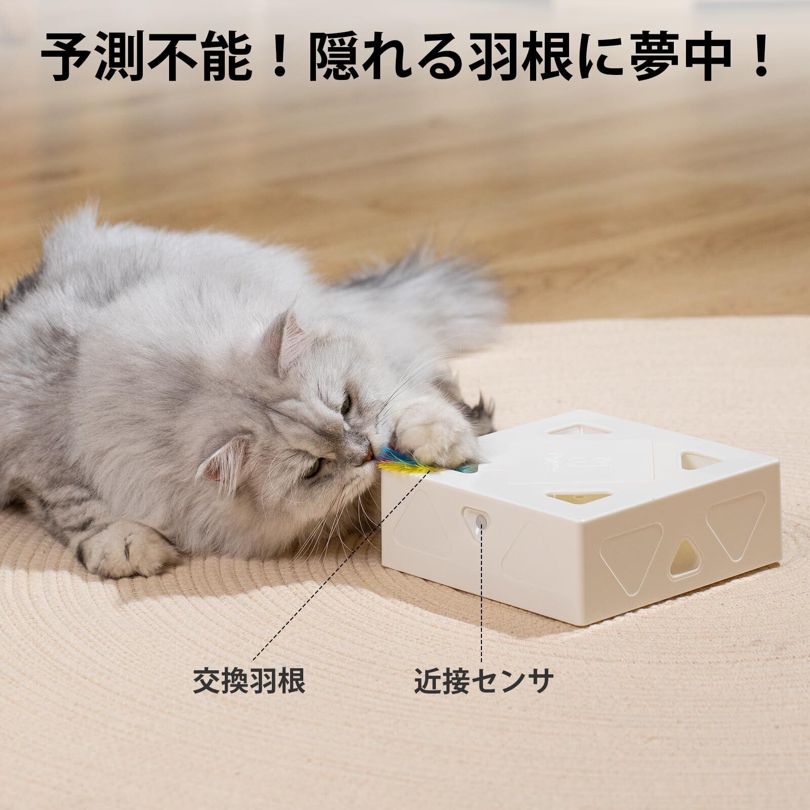 【近接センサー付きで留守番中の猫に適用】猫ちゃんが約1メートル以内にいると、玩具が自動的に起動し、羽根が穴から伸び出します。一人でお留守番している猫ちゃんも楽しく一人遊びができます。5分後に自動でオフになるので、電力の消耗を心配する必要もありません。