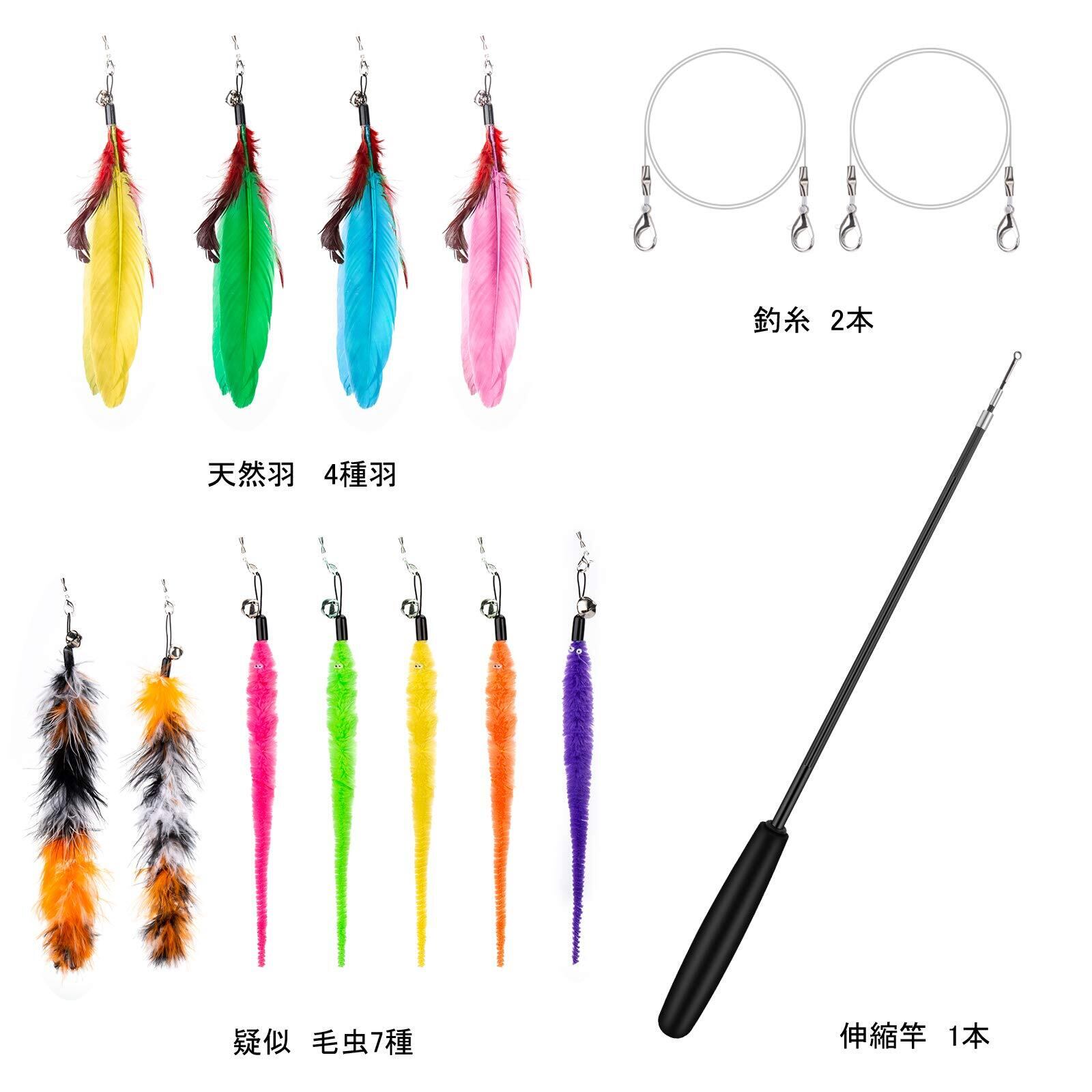 【セット内容】 猫 じゃらし 14点 セット( 天然羽 4種、疑似 毛虫 7種、伸縮竿 1本、釣糸 2種)猫ちゃんの好みに合わせておもちゃを交換できます。