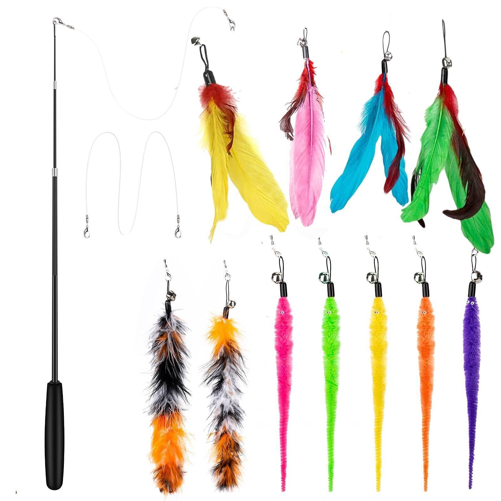14 点セット 猫おもちゃ ColiChili 猫じゃらし 天然 羽のおもちゃ 交換用羽11個 棒鈴付き 交換用釣り糸2個 ぶらぶら ペットグッズ ねこ用品