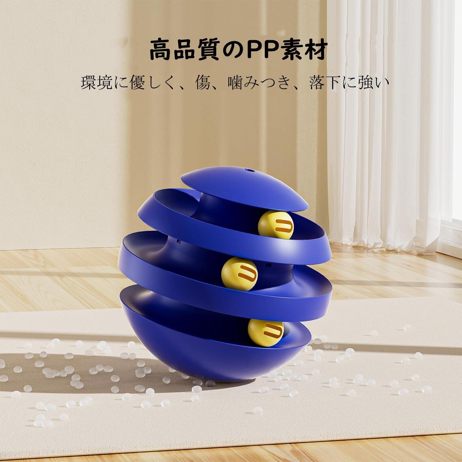 耐久性抜群! PP+ABSの高耐久素材で、猫の強い噛みつきにも耐えられます。不倒翁デザインで転がったら自動で立ち上がるので、遊び続けられます