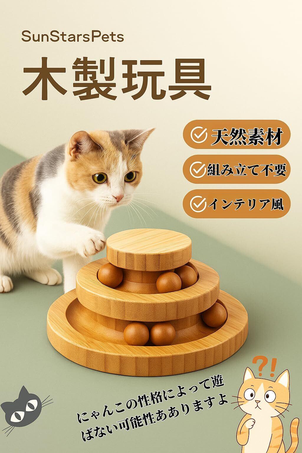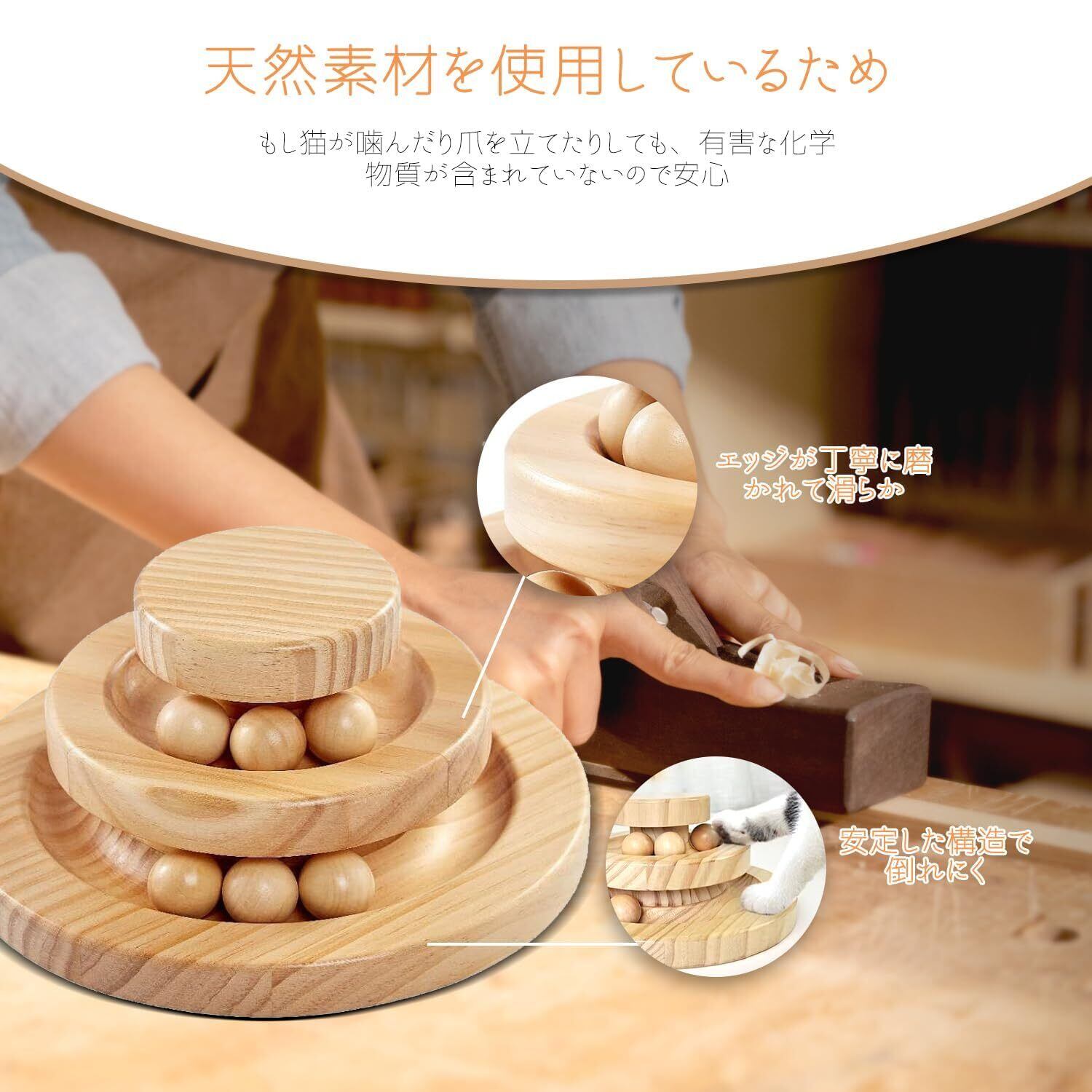 SunStarsPets 木製 猫用回転ボール タワー 組み立て不要 止まらない回転 猫おもちゃ 遊ぶ盤 ストレス解消 運動不足対策 ナチュラル安全素材 寂しさ解消 (二層, 松製)