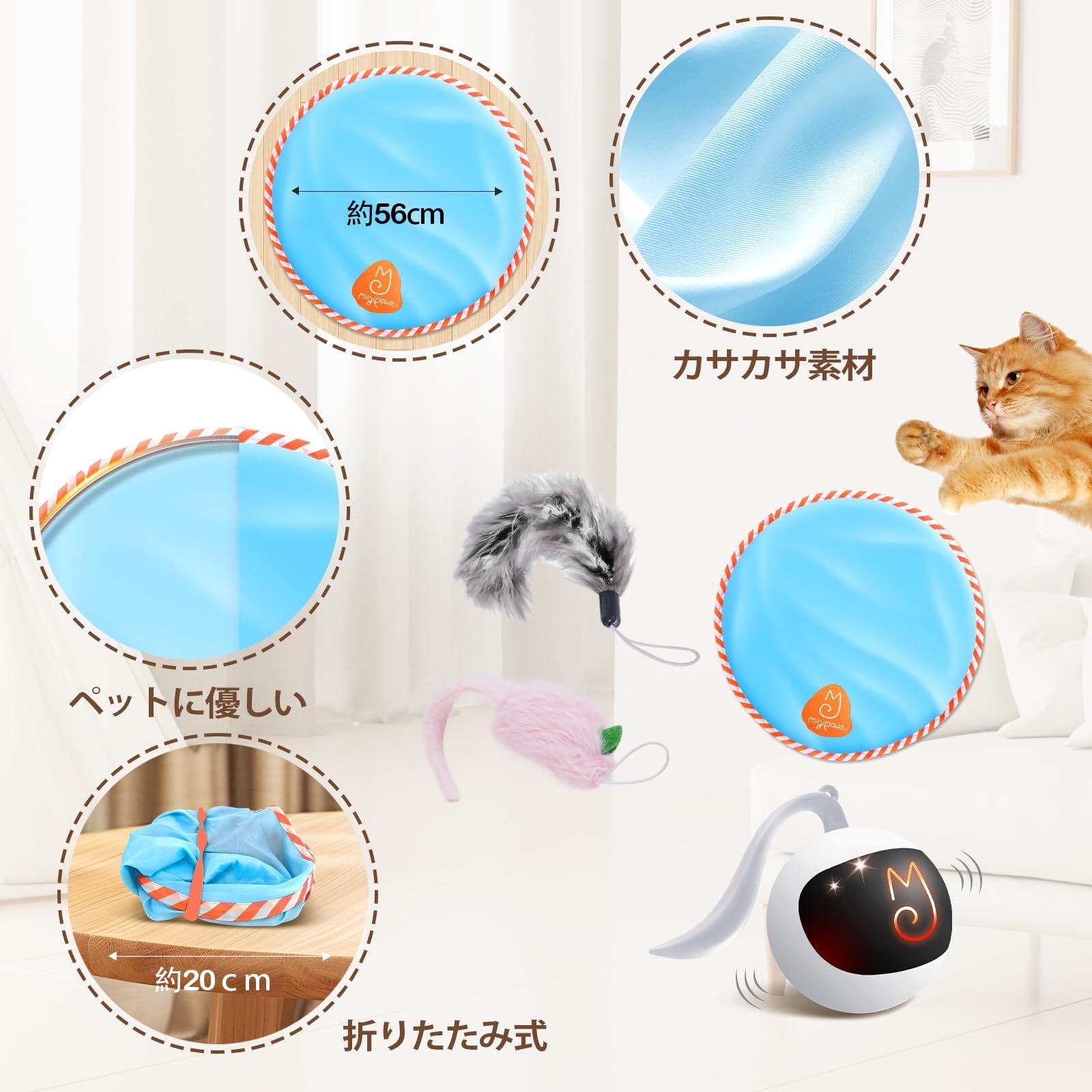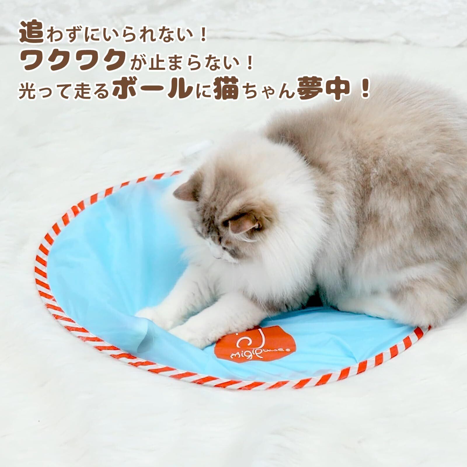 【光・音・動きのトリプル刺激】ボールはやわらかな光を放ちながら、不規則にくるくると回転。シート越しにちらっと見える光とカサカサ音、そしてランダムな動きが猫の好奇心を刺激し、室内でも自然に運動を促します。運動不足解消にも最適!