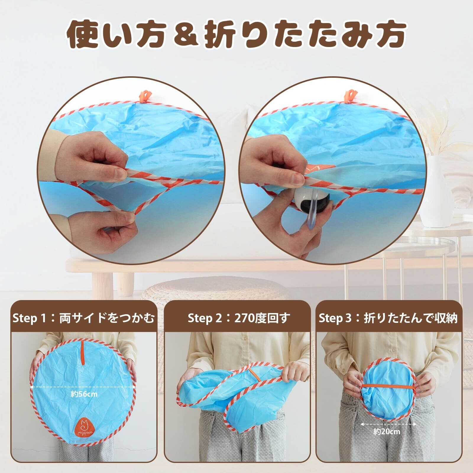 【折りたたみ式でコンパクト収納】使用時は直径約60cmのゆったりサイズ。使い終わったら両端を反対方向に270度ひねるだけで、直径約20cmにコンパクト化。付属のゴムバンドで固定すれば、省スペースでスッキリ収納・持ち運びもラクラク。