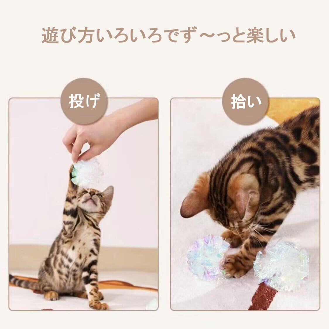 安全設計で安心プレイ:日本安全基準をクリアした耐咬性素材を使用。誤飲防止の適度な大きさ(直径5cm)で、子猫から成猫まで安全に遊べるペット用品です。