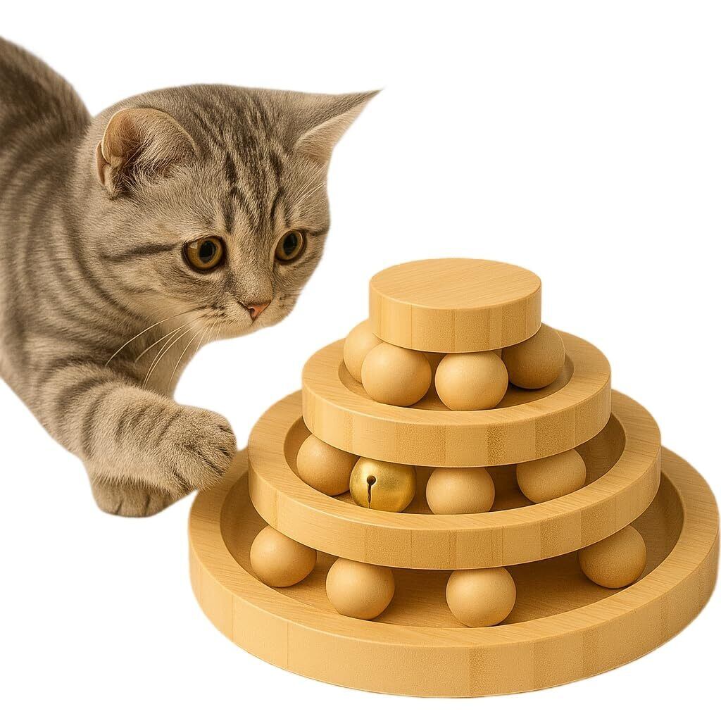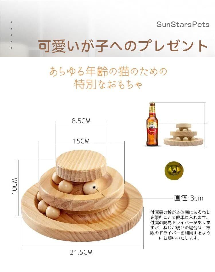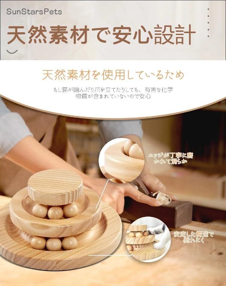 SunStarsPets 木製 猫用回転ボール タワー 組み立て不要 止まらない回転 猫おもちゃ 遊ぶ盤 ストレス解消 運動不足対策 ナチュラル安全素材 寂しさ解消 (三層, 松製)