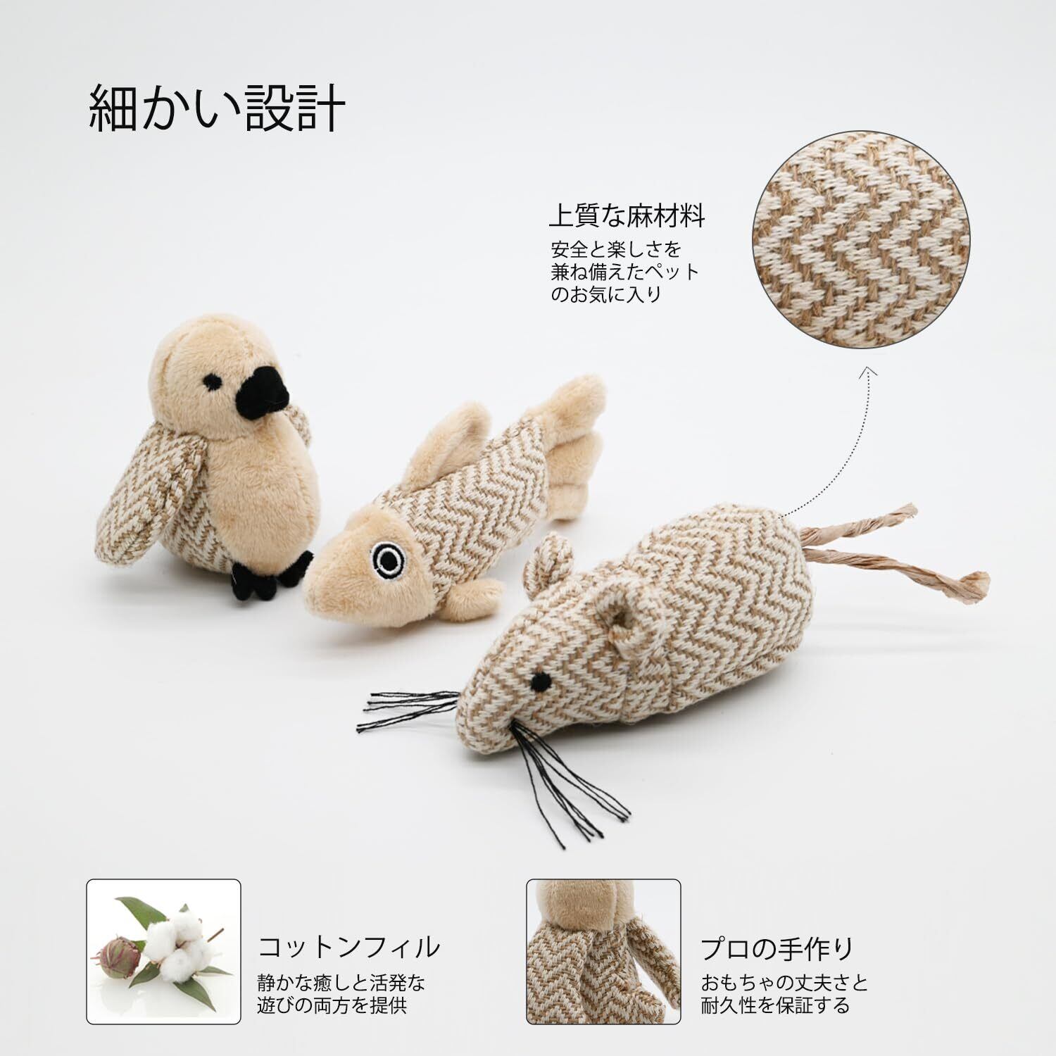 猫のネズミのおもちゃ 天然の麻材料 ネズミと魚と小鳥 フルーツいぐるみ 猫用玩具 猫遊び 噛むおもちゃ 運動不足解消 ストレス解消 (3個入,ネズミ+魚+鳥)