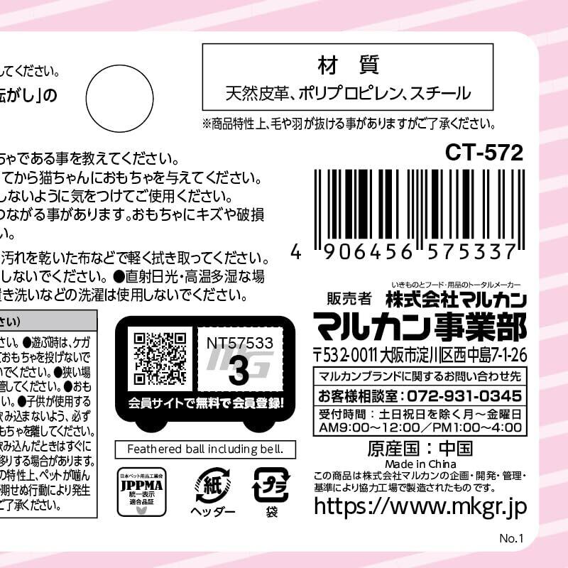 おもちゃを見せて、猫ちゃんに一緒に遊ぶおもちゃである事を教えてください。おもちゃの使用に安全な環境である事を確認してから猫ちゃんにおもちゃを与えてください。周囲に壊れやすい物がない事を確認し、ケガをしないように気をつけてご使用ください。破損したおもちゃを誤飲すると重大な事故につながる事があります。おもちゃにキズや破損がないかこまめに確認しながら使用してください。※別売「CT-571 猫じゃらし コロコロにゃん転がし」の取替用としても使用できます。