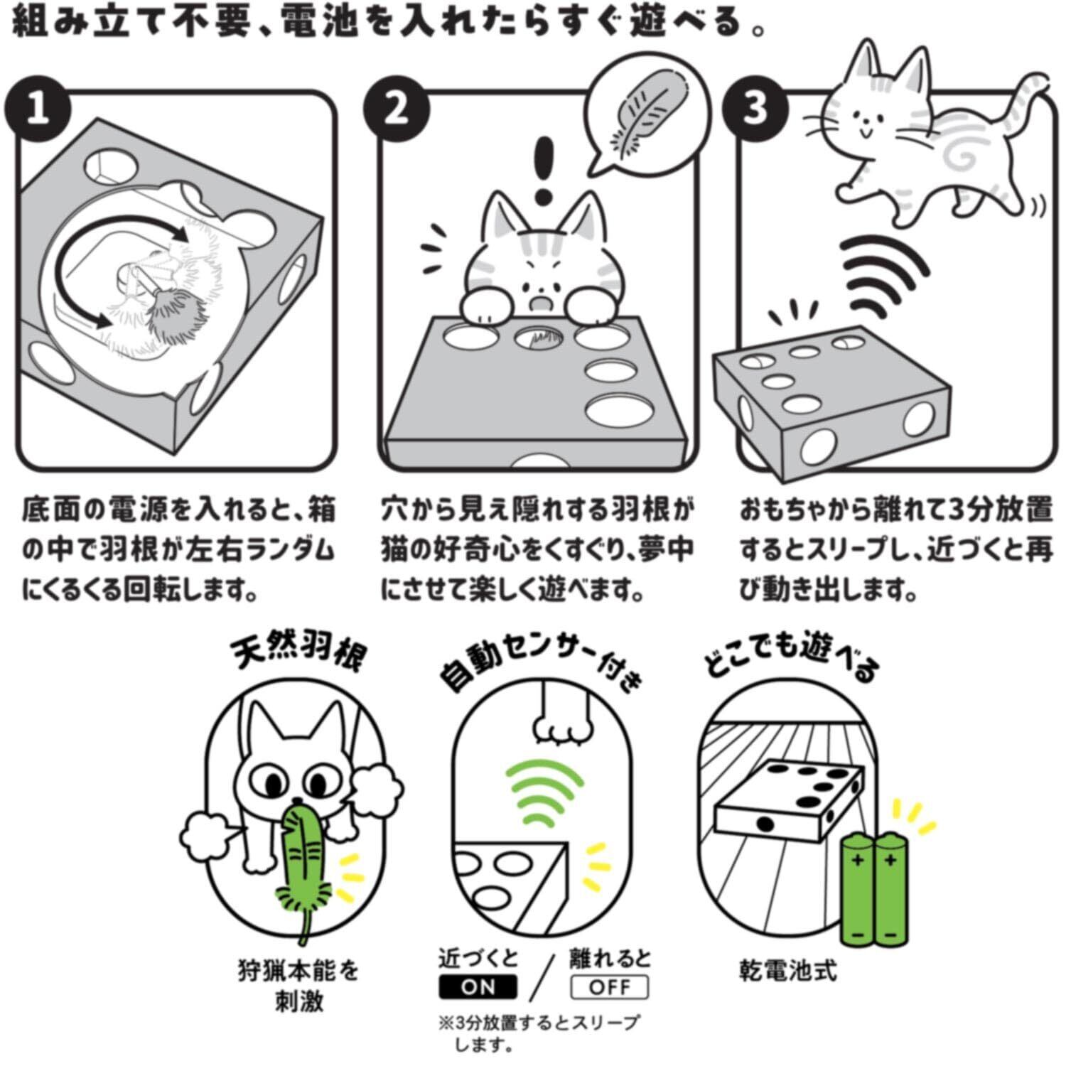 ●猫ちゃんが近づけば箱の中で羽根が動きだし、穴から覗く猫ちゃんを刺激。3分放置で再びスリープ状態に。
