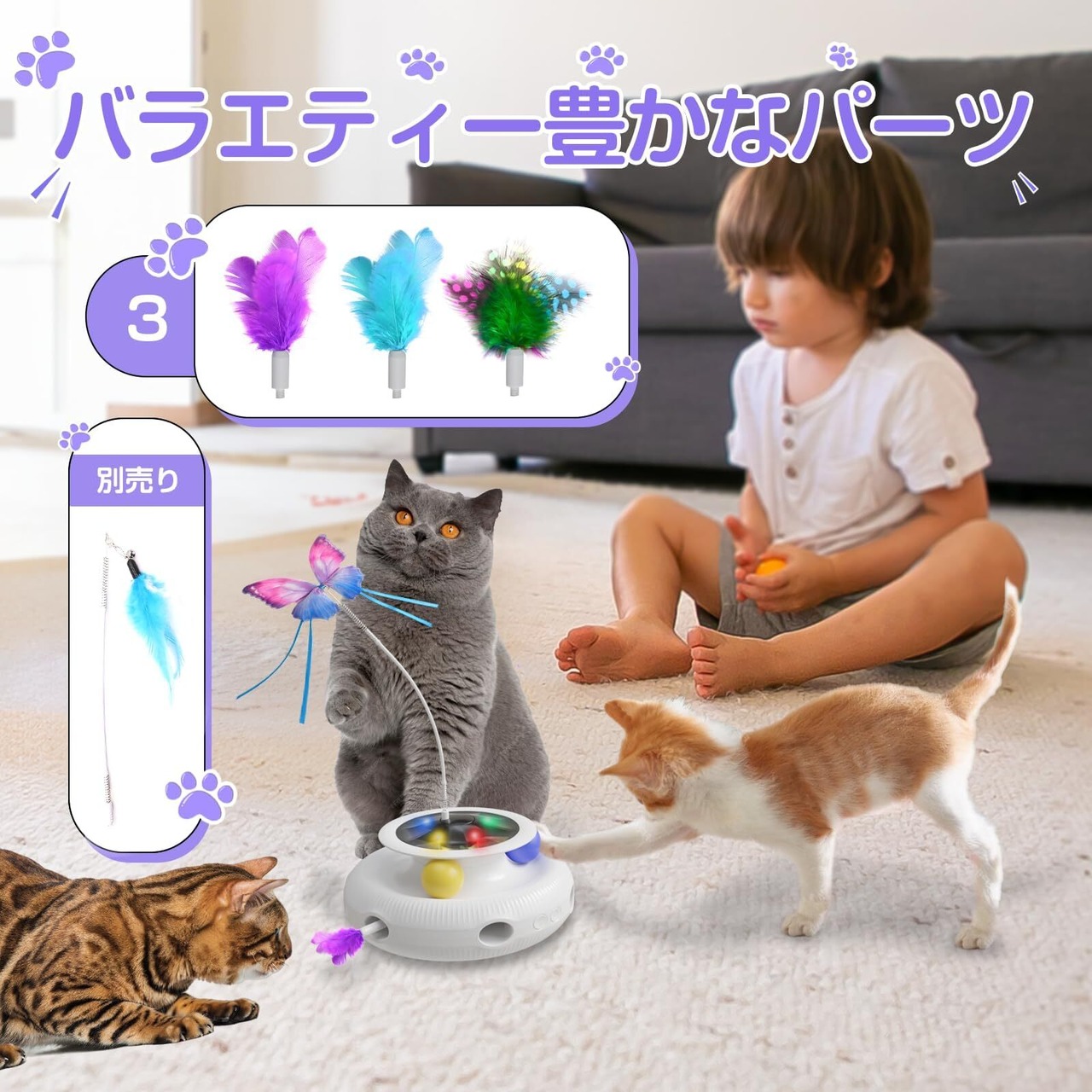 【4in1猫 おもちゃ】猫 玩具 は360°回転できる蝶々、飛び出す羽根、グルグル回るボール及びLEDライト設計で猫ちゃんのの狩猟本能を刺激します。蝶々の 猫じゃらし はプラスチックの代わりに布で作られていて、安心して使用できる素材です。猫おもちゃ 本体下部にある6つの穴から羽根はランダムに飛び出して、モグラたたきとして猫ちゃんの好奇心を刺激できます。そして、猫 玩具 ボール2つで猫のストレス解消や運動不足解消として最適な室内猫玩具です。さらに、猫のおもちゃ の上部にカラフルなLEDライトを搭載し、猫ちゃんの興味を惹きつけることだけでなく、お留守番時のストレス発散にも最適です。