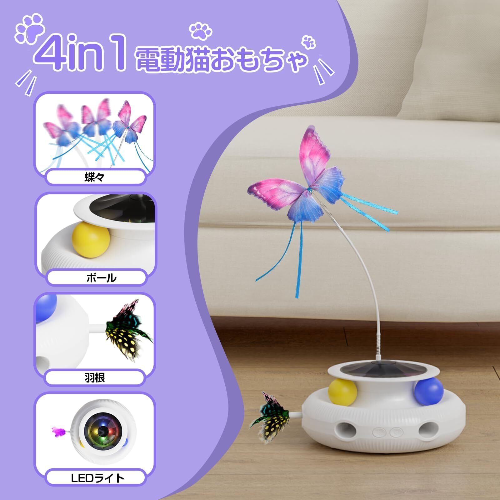【最新型】NUYIERA 猫 玩具 一人遊び 猫 おもちゃ 4in1猫じゃらし 【蝶々回転/猫ボール/羽根飛び出し/LEDライト付き】 電動 自動 猫用 ねこ 知育玩具 ランキング 人気 飽きない 天然素材 室内 寂しさ解消 ストレス解消 運動不足対策(本体)