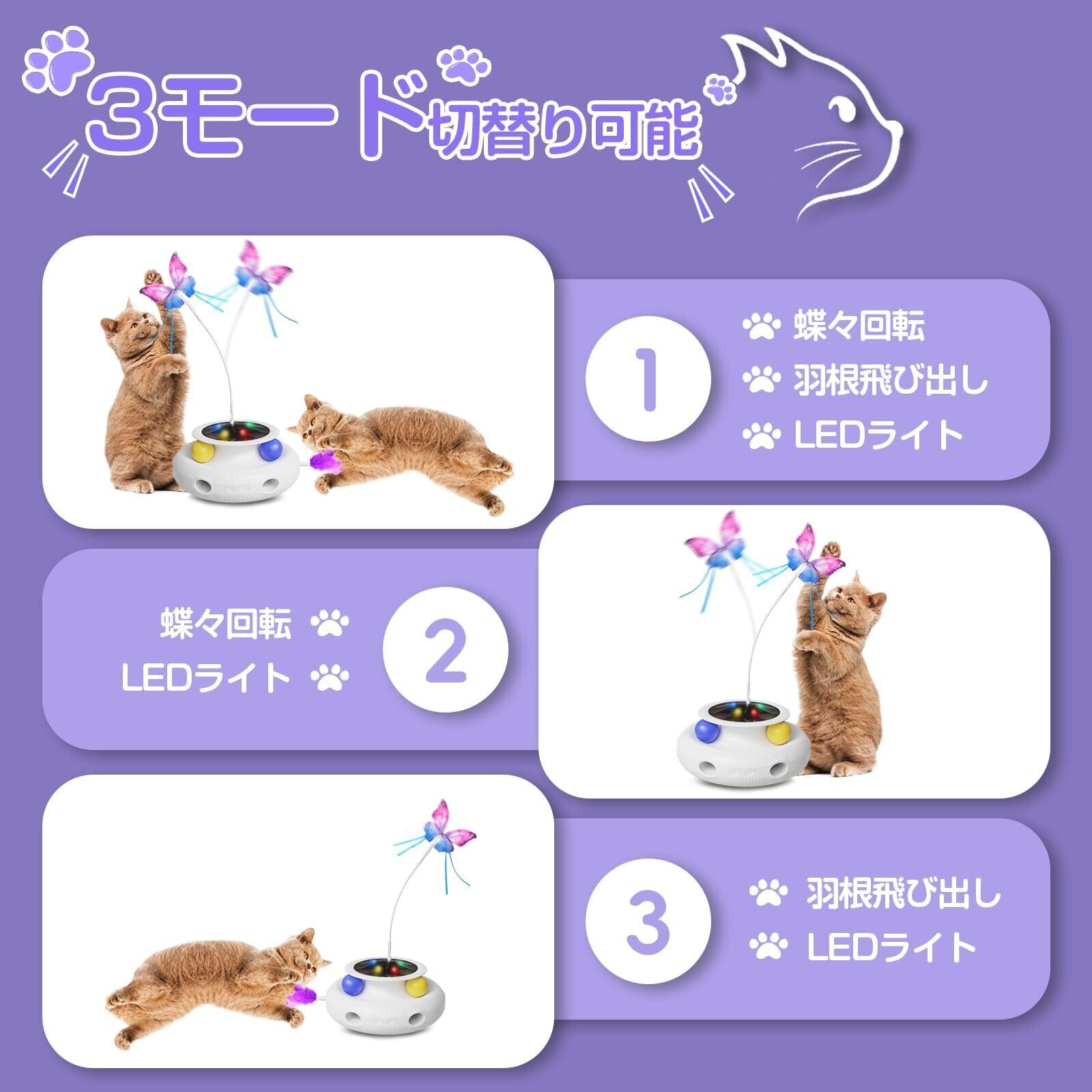 【3モード付きの猫 玩具】猫 おもちゃ は操作簡単です。電源ボタンを押して、自動的にモード1になり、LEDライトが点灯し、蝶々周り、羽根飛び出します。隣のボタンをおしてモード2になり、蝶々回りのみになります。押し続けると、LEDライトのみ点灯します。猫ちゃんのお好みに合わせて切替できる猫 知育玩具です。