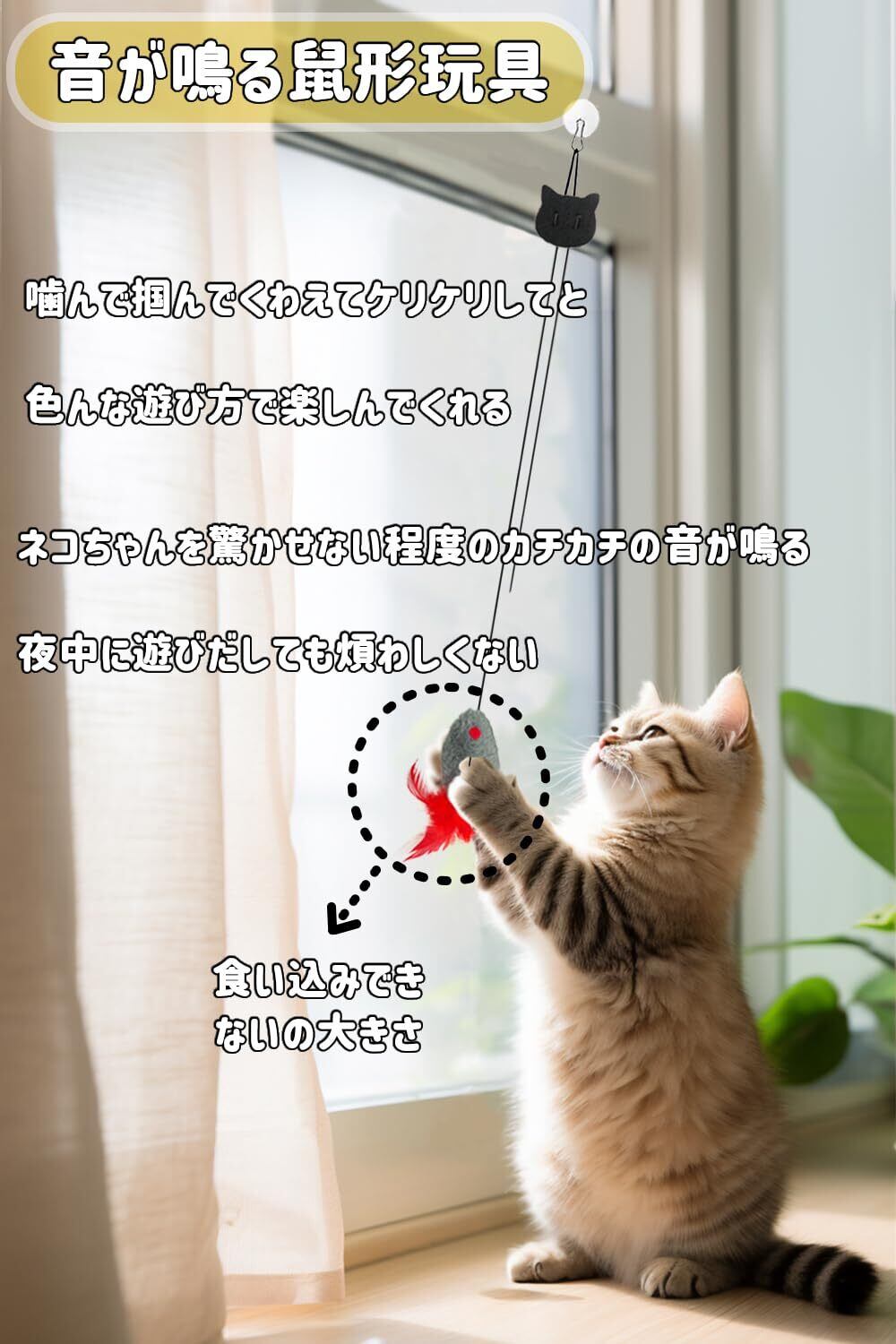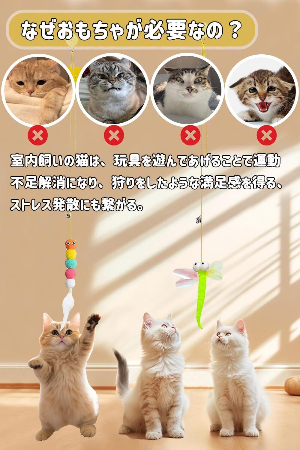ストレス軽減&一人遊び:屋内飼いの猫にとって、運動不足やストレスは課題となることがありますが、猫じゃらしを使って遊ぶことで、猫のストレスを解消できます。さらに、遊びを通じて、猫は自然の狩猟本能を刺激され、知的な刺激を得ることができます。これにより、猫の認知能力が向上し、知的な活動が促進されます。しかし、多忙な生活に追われる飼い主の方々には、猫の遊び相手としての十分な時間を取ることが難しい場合もあります。そこで、は吊り上げ式の猫 おもちゃを開発しました。天井やドア枠に簡単に取り付けるだけで、猫は自分から遊びを始めることができます。これにより、飼い主の介入なしで楽しむことが可能で、特に遊びたい盛りの仔猫や運動不足気味の成猫、シニア猫におすすめです。
