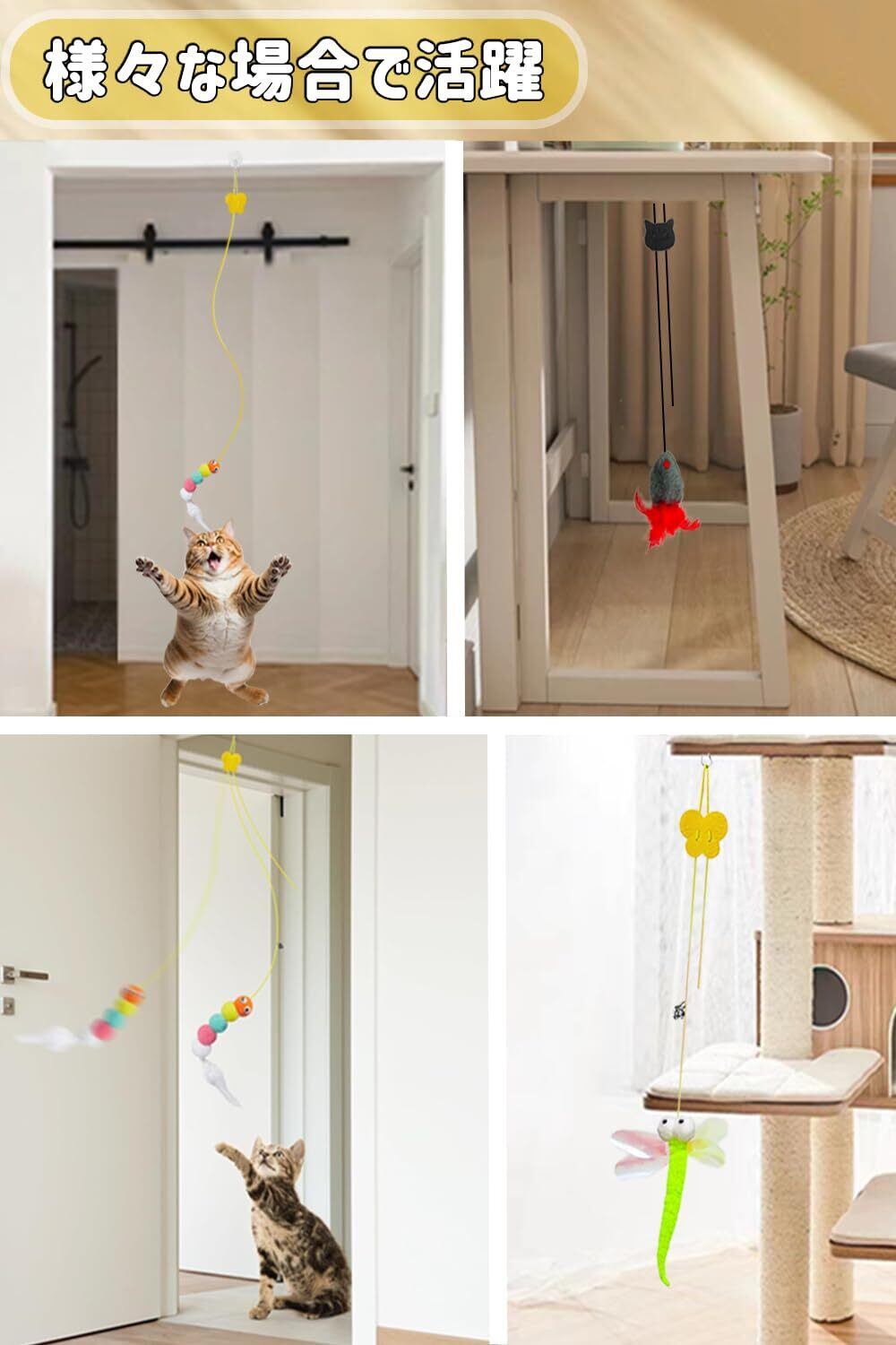 取付簡易&弾性ロープ:この猫じゃらしは両面テープを使用して取り付けるため、ネジ穴を開けたり、工具を使ったりする手間が不要で、家具にダメージを与えることもありません。さらに、脱落の心配が少なく、何度も再利用できるのが魅力です。天井、階段、窓、テーブル、ドア枠、キャットタワーなど、猫が頻繁に遊ぶ場所に配置することをお勧めします。付属の紐は弾力性が高く、切れにくいため、猫が誤って紐を飲み込む心配がありません。最長約1.8m、長さを随時調整可能、ジャンプが好きな子、低いところを素早く動くのが好きな子、ランダムな動きが好きな子など、千差万別。ぜひ愛猫が夢中になる高さを見つけて、置いてください。