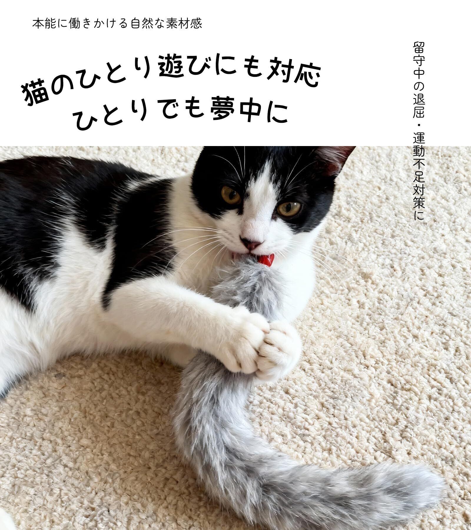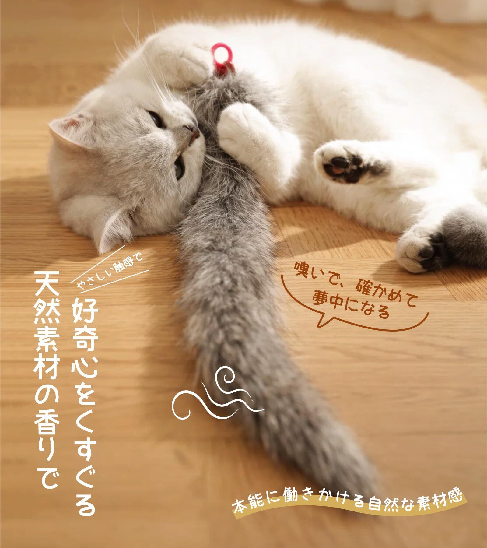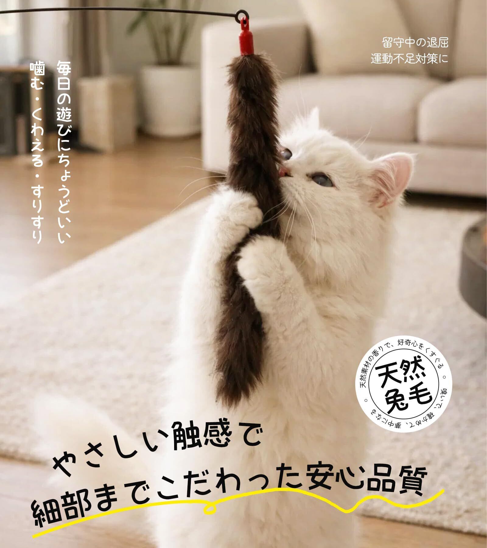【天然素材・柔らかい毛料・口に優しい猫用品】柔らかい毛料で噛んでも口にやさしく、安全素材設計。天然兔毛ヘッドは化学的な香りではなく、原始の自然な素材气味をそのまま保持。釣り竿の動きと組み合わさることで、猫の嗅覚と興味を同時に刺激し、思わず飛びつきたくなる“気になる存在”に。