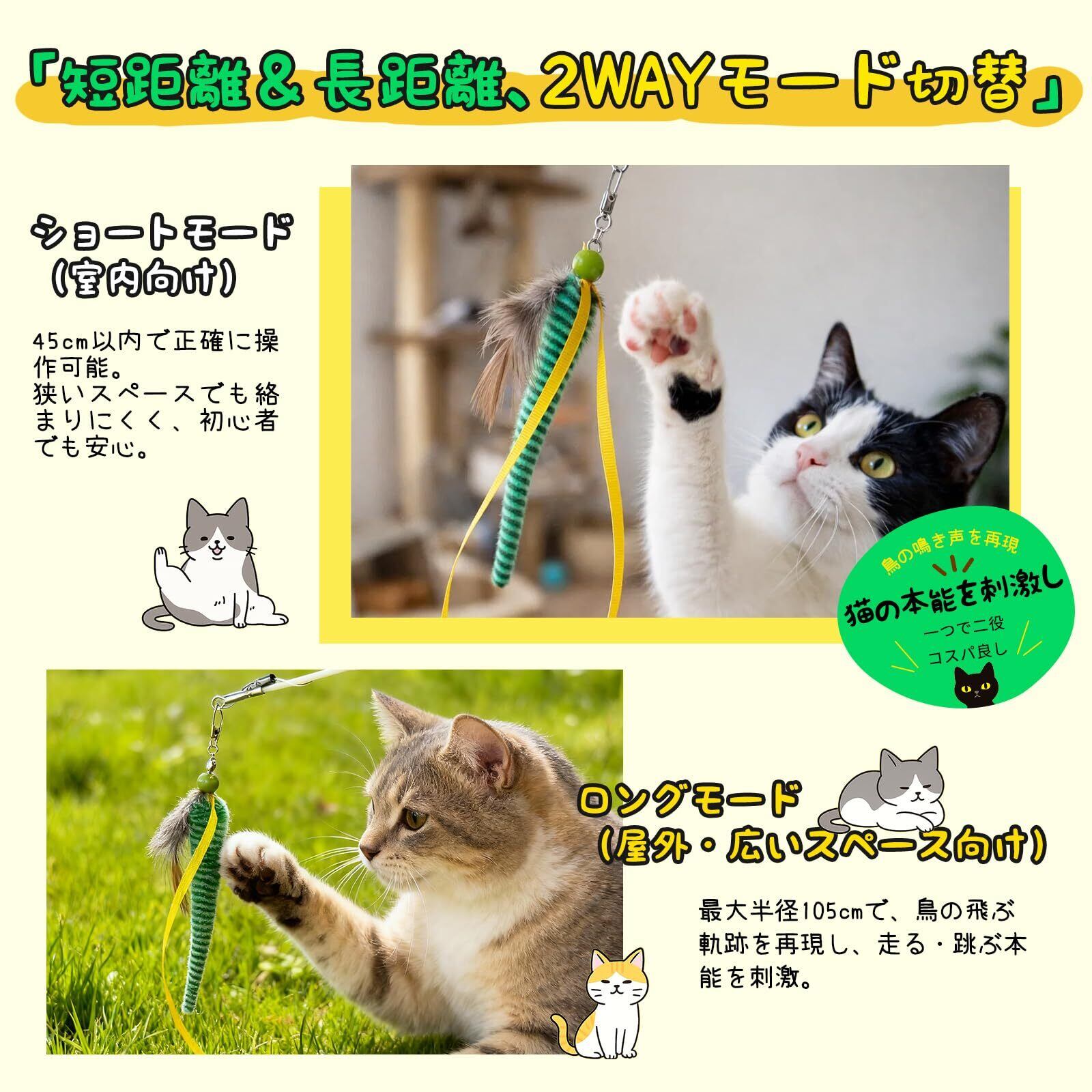 【2WAY長短モード猫おもちゃ】ワンタッチで短距離モード(室内向け)と長距離モード(屋外・広い空間向け)を切替可能。短距離モードは45cm以内で家具に絡みにくく、小スペースでも安心。初心者の飼い主でも扱いやすく、気軽にスキンシップが可能。長距離モードは105cmの超ロング半径で鳥の飛行軌跡を再現し、猫のジャンプやダッシュを引き出して十分な運動を提供します。
