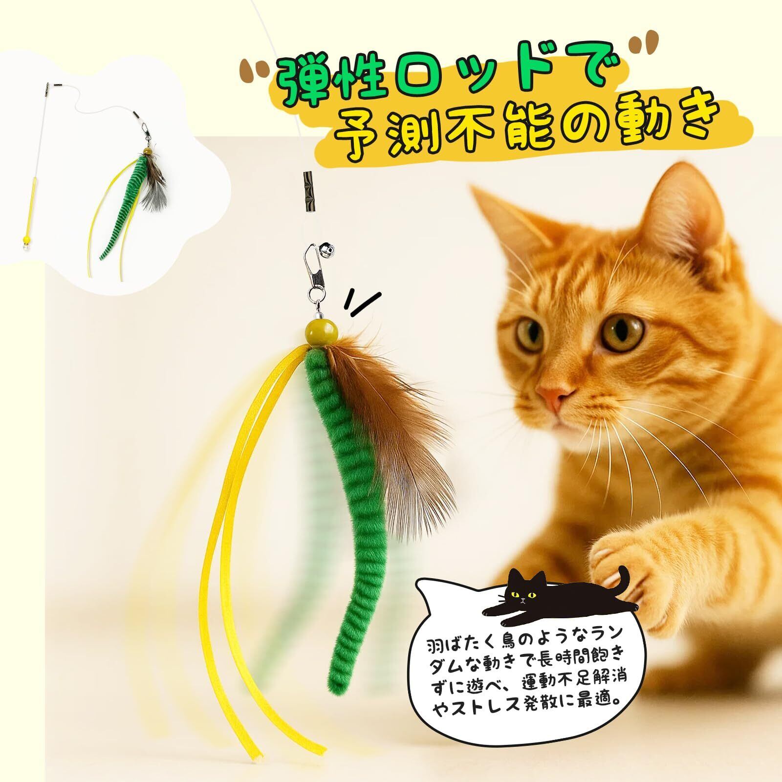 【弾性ロッドでリアルな動き】 しなやかな弾力性のあるロッドが、羽ばたく鳥のようなランダムで予測不能な動きを再現。猫のハンティング本能を強力に刺激し、退屈知らずで長時間遊べます。さらに、猫遊び道具の釣り糸は丈夫で噛んでも切れにくく、安心して遊ばせられます。