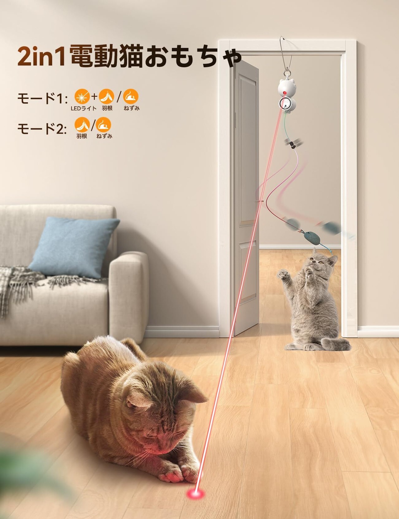 猫おもちゃ一人遊び 2in1電動猫じゃらし 猫玩具 LEDライト FEELNEEDY 動くおもちゃ 自動 USB充電式 飽きない ネコ おもちゃ 人気 お留守番に 運動不足解消 狩猟本能を刺激 ぶら下げる 羽/ネズミ 猫ちゃんへのプレゼント
