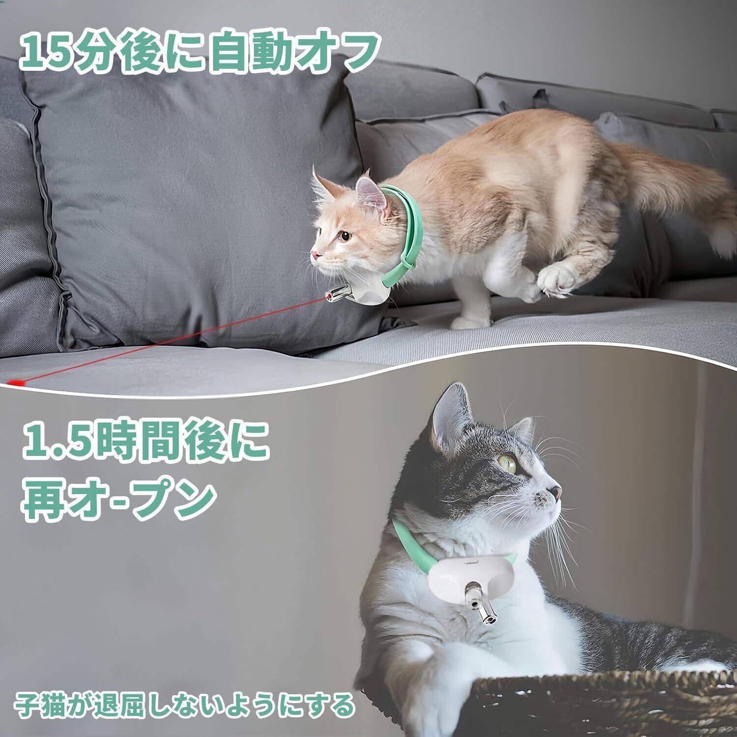 【自動制御機能】2 つの光モード(点灯と点滅)を備えており、猫の注意を効果的に引きつけます。15 分間作動後、自動的にオフになり、1.5 時間後に再起動します。これにより、長時間にわたって猫を楽しませることができます。