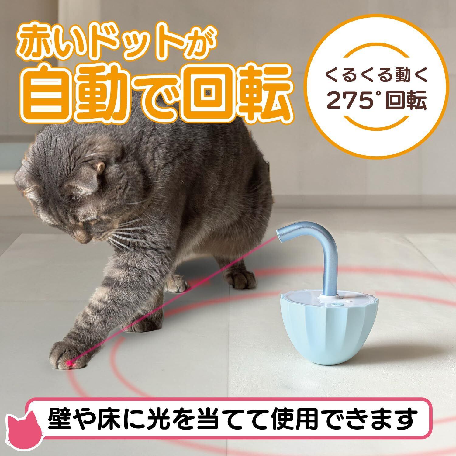 【自動LEDライト】ランダム回転のLEDライトで猫の狩猟本能をくすぐります。ネコちゃんのひとり遊びにオススメのおもちゃです。子猫から成猫まで幅広いライフステージで楽しむことができます。