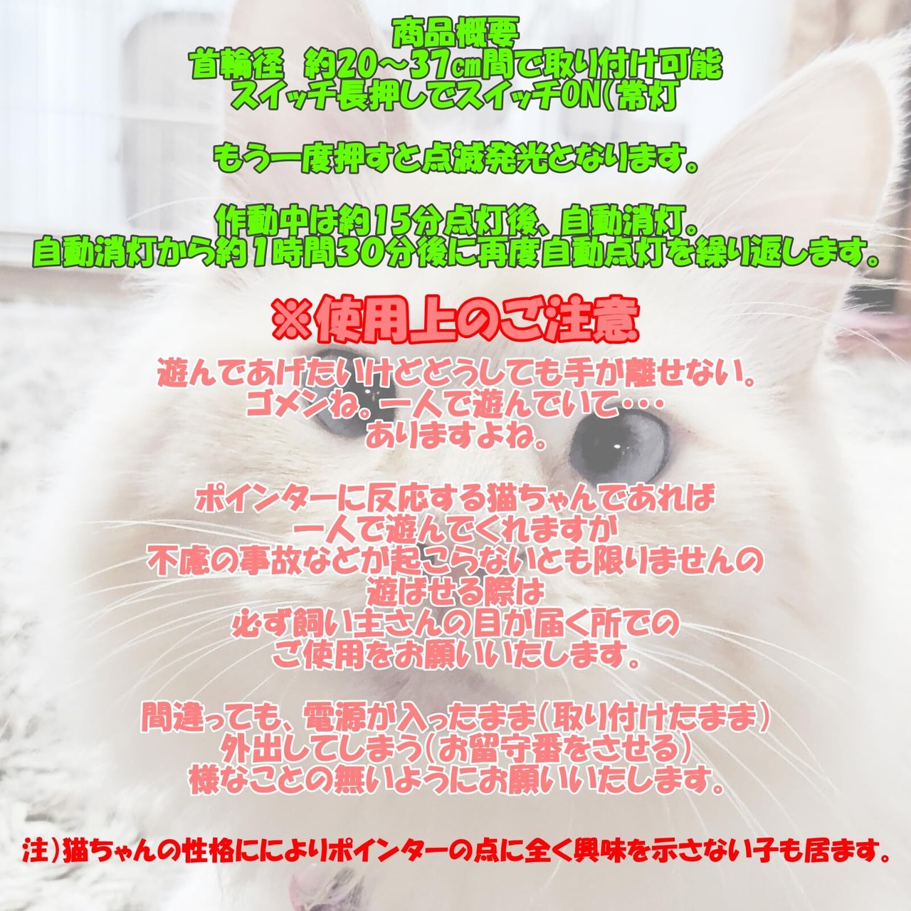 ※使用上の注意 ポインターを追いかけるの夢中となり首輪(LEDポインター)がどこかに引っ掛かる・・など不慮の事故を防ぐ為、商品を作動させたまま(取り付けたまま)お留守番をさせる様な事は避けてください。 飼い主様の目が届く場所での使用をお願いいたします。
