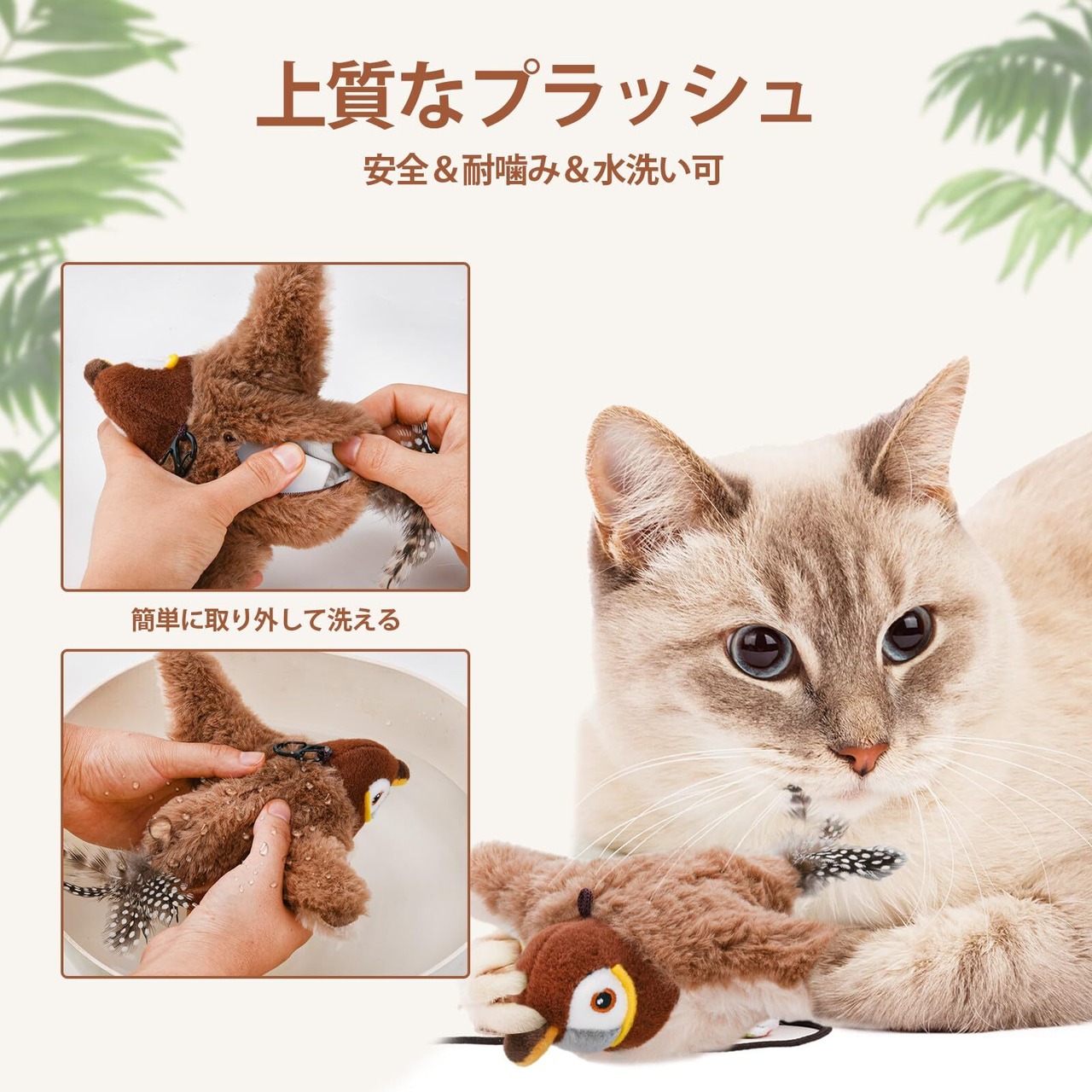 LIFLIX 猫 おもちゃ 鳥 電動 タッチ起動 動くぬいぐるみ 羽ばたく リアルな鳴き声 一人遊び またたび入り 充電式 スズメ