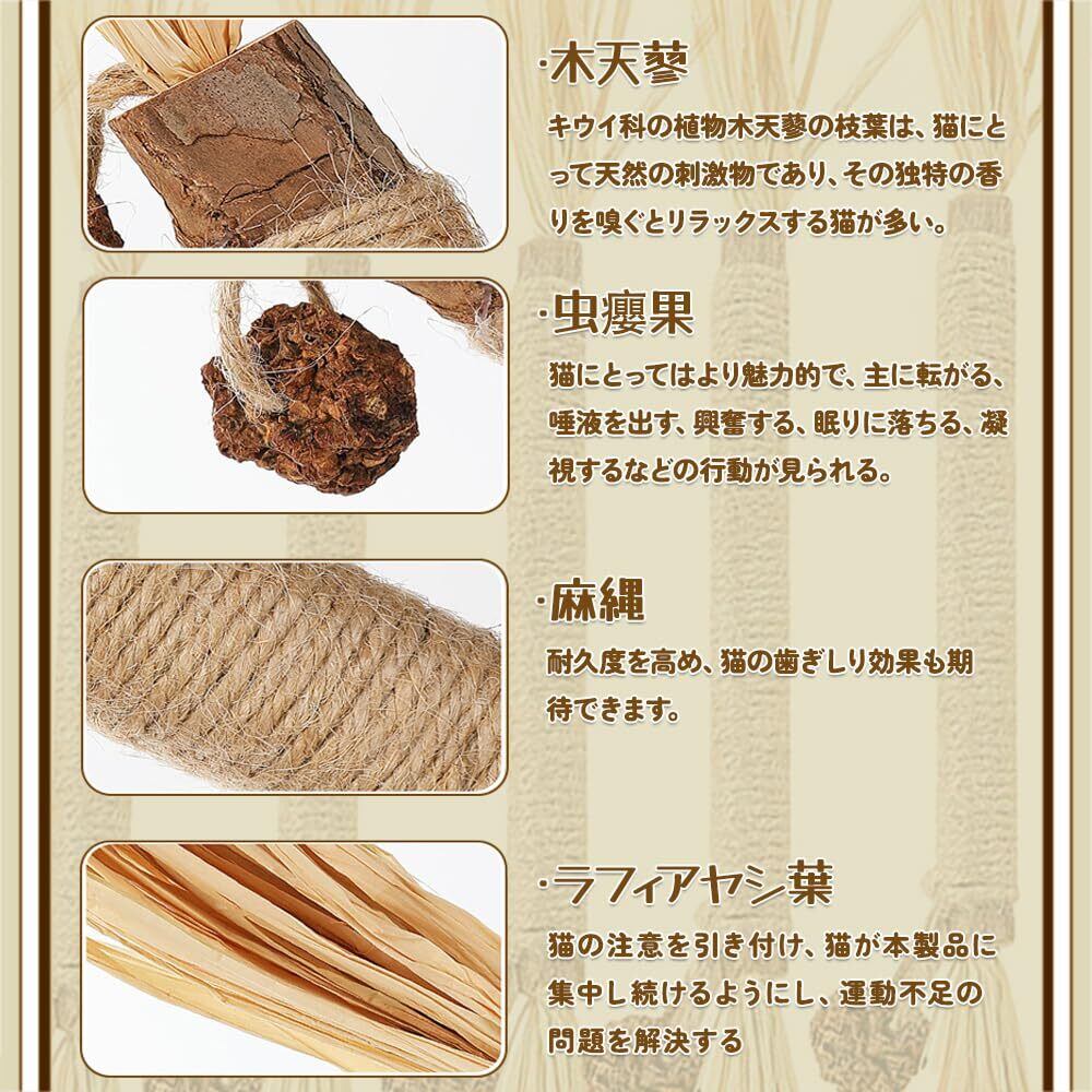 1.本製品は木天蓼、虫癭果、ラフィアヤシ葉、麻ロープで構成されています