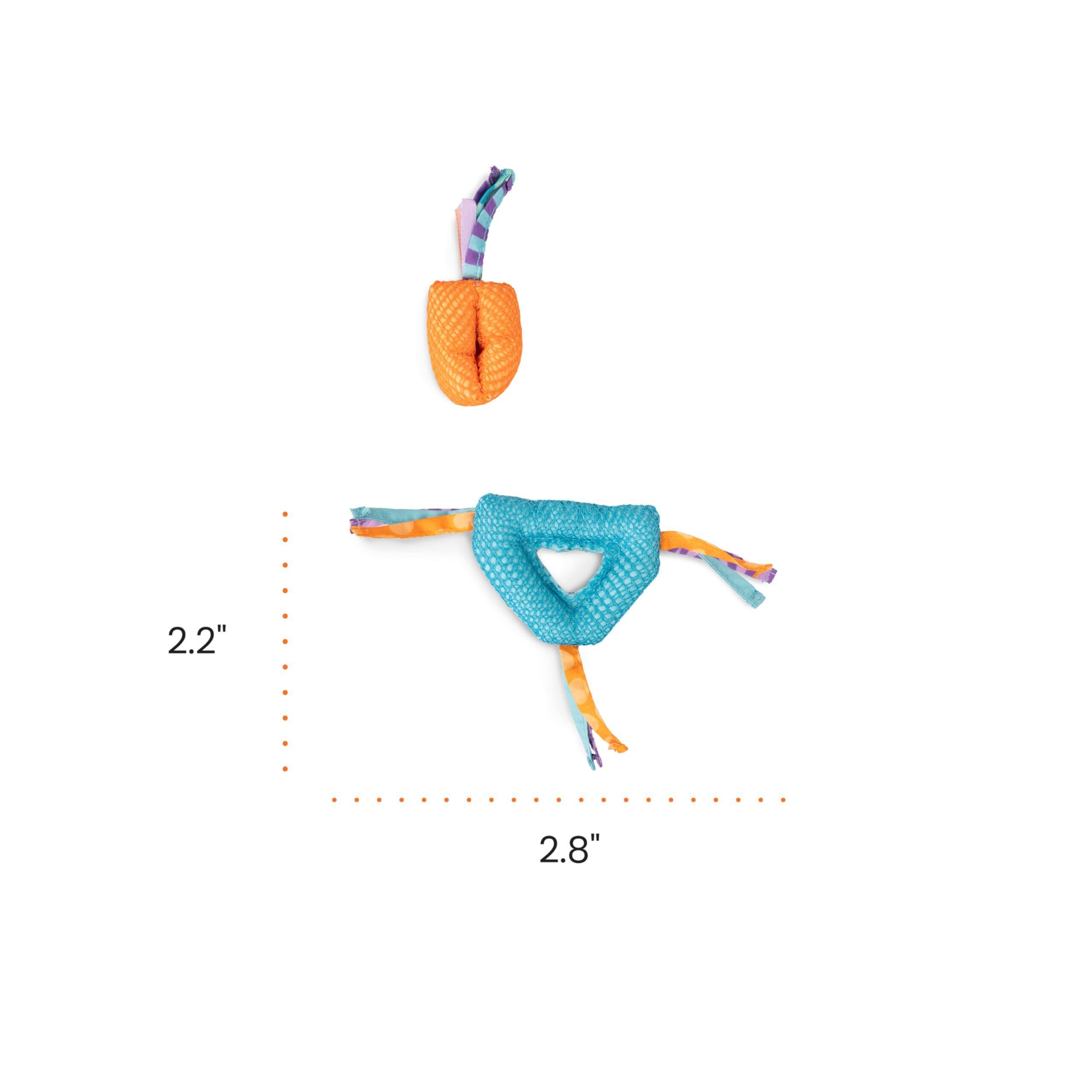 カラフルなリボン付きのリングにネットをかけたこのおもちゃは、ネコの歯の健康をよく考えています。 軽量なので、くわえて運んだり振ったりしやすく、遊びながらこのネットカバーを噛むことで、たまりがちな歯石を取り除き、歯ぐきをマッサージします。 リボンはネコの大好きなキャットニップ(ハーブ)をくるんでいて、興味を惹きつけながら刺激を与えることでいつまでもよく遊びます。 ■お口の健康を促すネット付きリングは噛むことで自然に歯ぐきをマッサージし、歯石も取り除いてくれます。キャットニップ(ハーブ入り)でカミカミの意欲も促進。