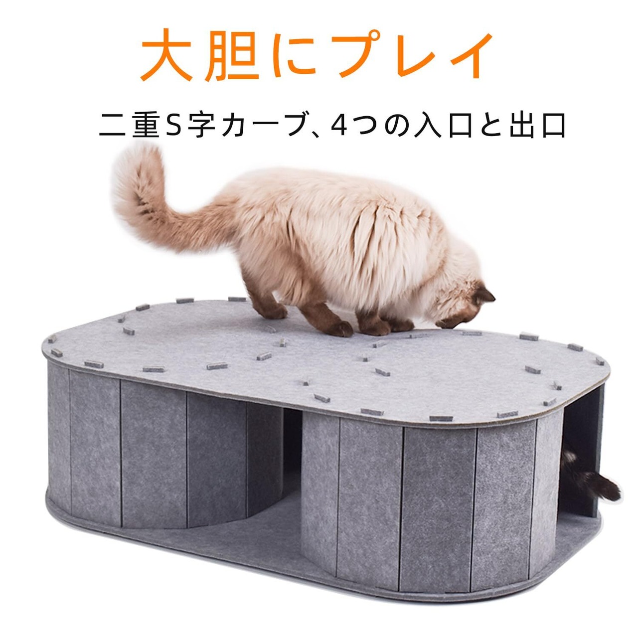 【商品デザイン】猫用トンネル迷路は、遊び場、隠れ家、爪とぎボード、休憩スペースが一体になった猫トンネルおもちゃです。