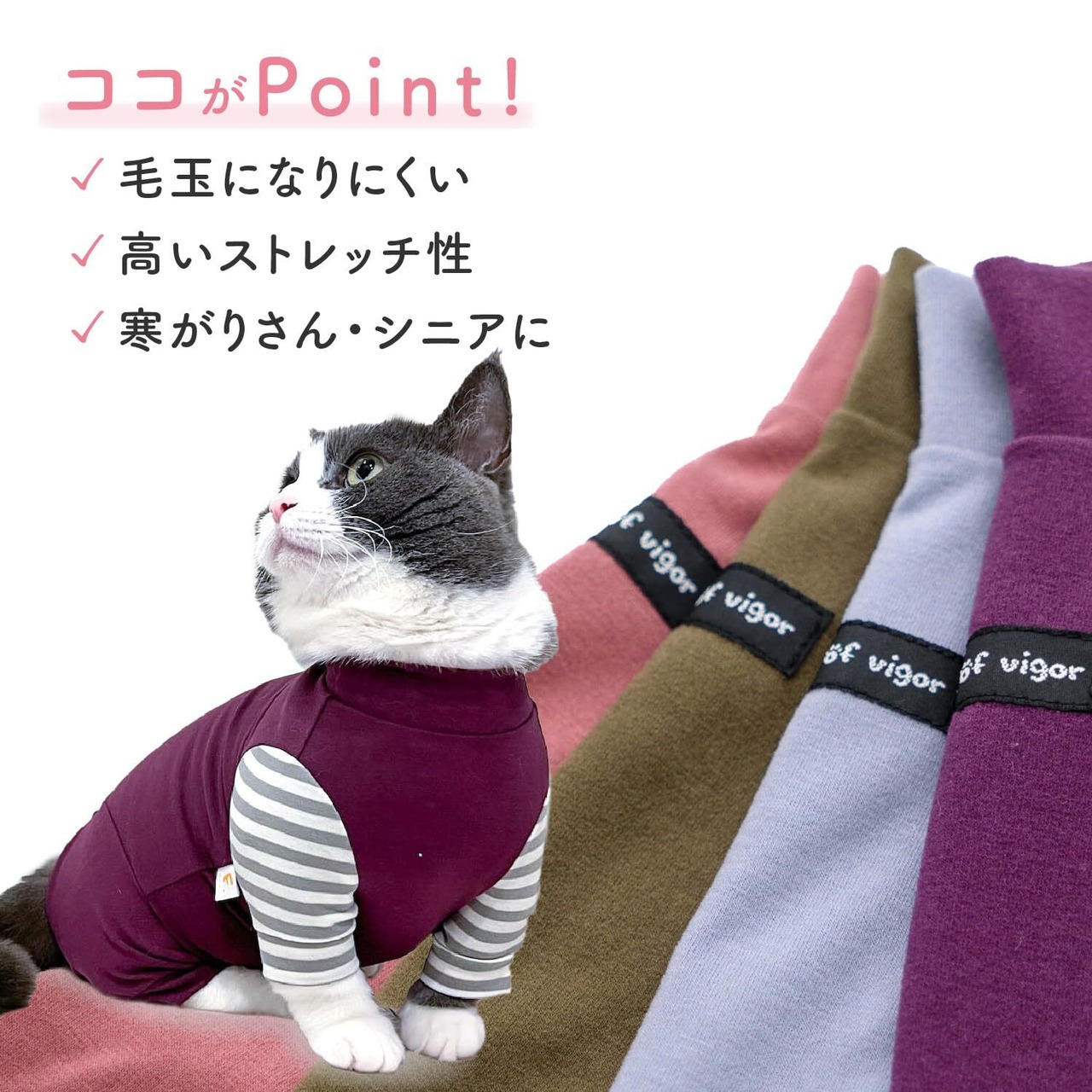 ●お洗濯について:手洗い又は、洗濯ネットを使用。当て布をして中温。ファスナー・ボタン・面テープがある商品は、しっかり止めた状態で洗濯をしてください。 なぜ猫に服を着せるの? 自由を好む猫にとって、服を着ることはストレスになることもあります。 しかし、手術後の傷口を舐めるのを防いだり、皮膚トラブルや介護の際には、服が治癒を助けて生活を快適にします。 フルオブビガーは長年にわたり猫の習性や動きを研究し、「猫が嫌がらずに着てくれる服」を追求。多くの猫と飼い主さんに支持されています。 猫ちゃんの着用時のポイント 最初は歩き方がぎこちなくなったり、転んでしまうことも。慣れるまでは、そばで優しく見守ってあげてください。 国内の縫製工場と連携して、一つひとつ丁寧に仕上げています。心地よい着心地をお楽しみください。
