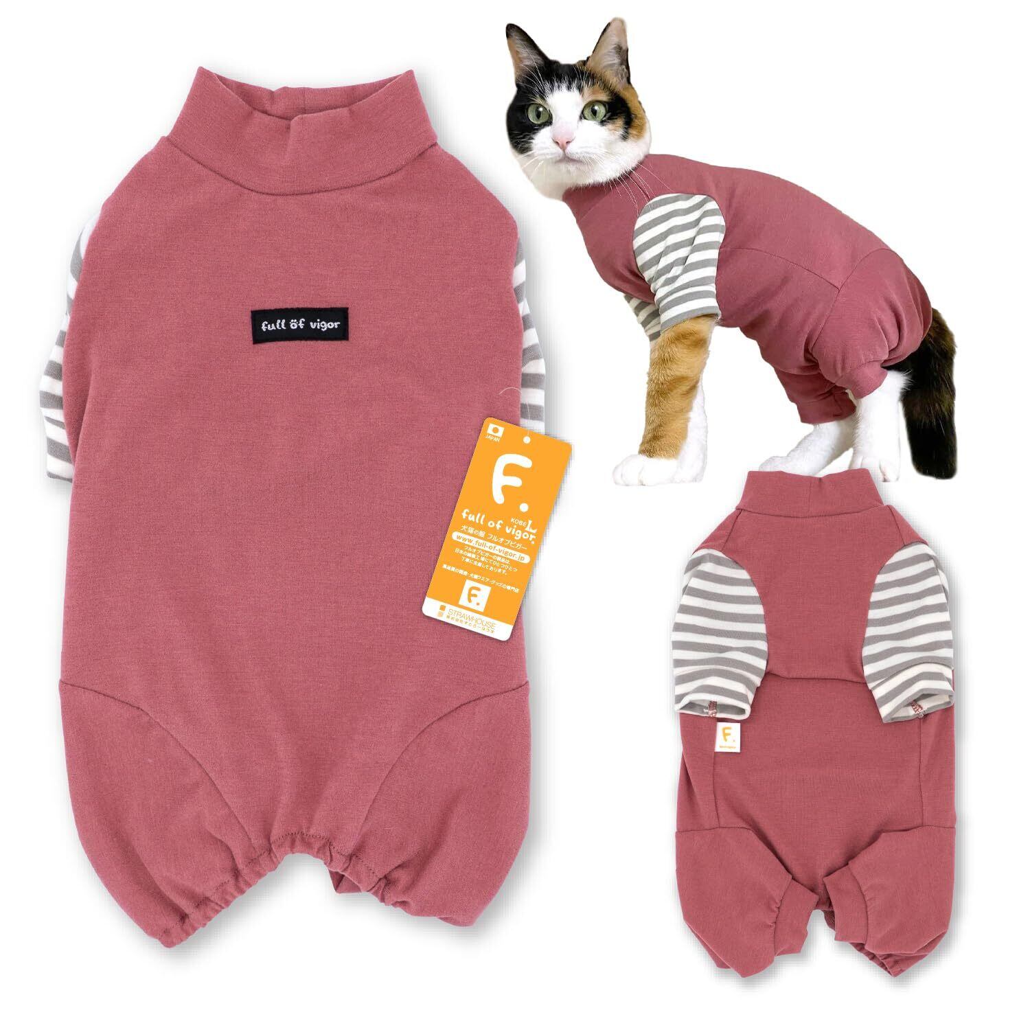 猫服 猫用 伸びて 着せやすい ウォームボーダー 長袖 つなぎ ロンパース 抜け毛対策 長袖 猫の服 フルオブビガー 26/濃いピンク CS
