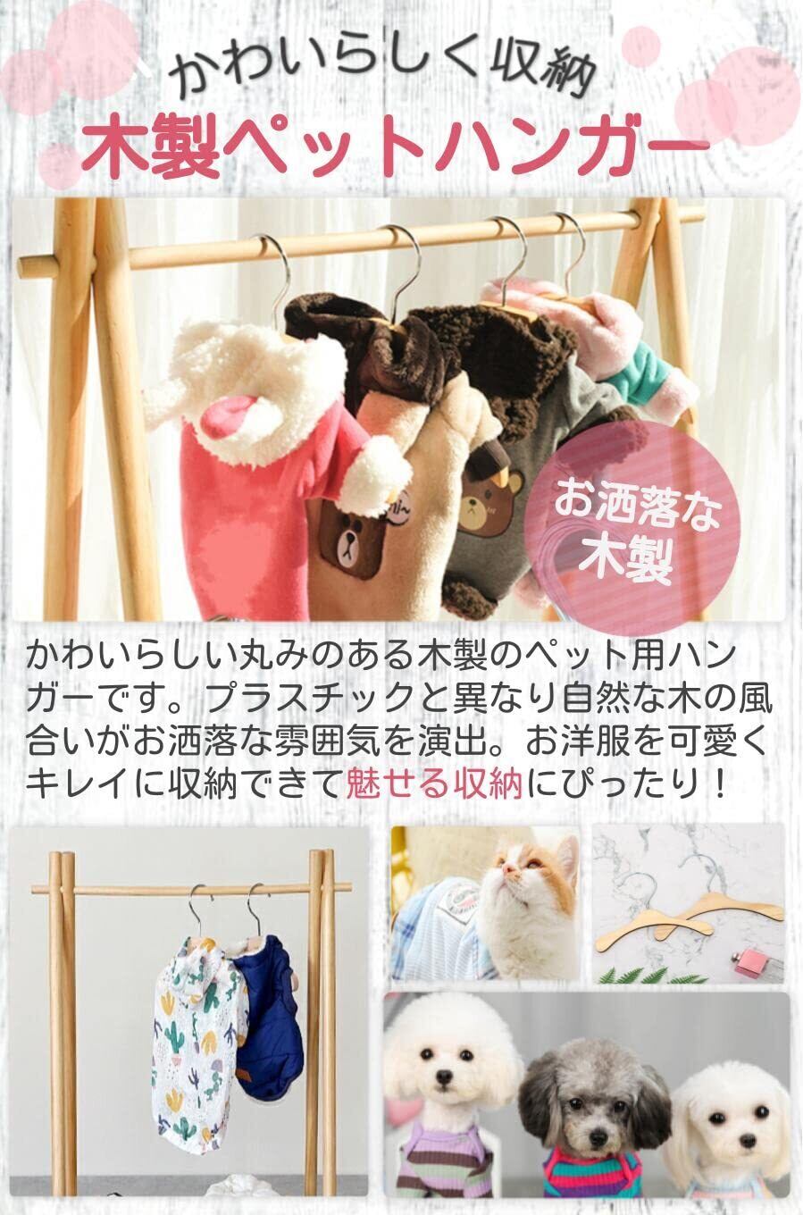 【木製ペットハンガー】かわいらしい丸みのある木製のペット用ハンガーです。プラスチックと異なり自然な木の風合いがお洒落な雰囲気を演出。お洋服を可愛くキレイに収納できて魅せる収納にぴったり!
