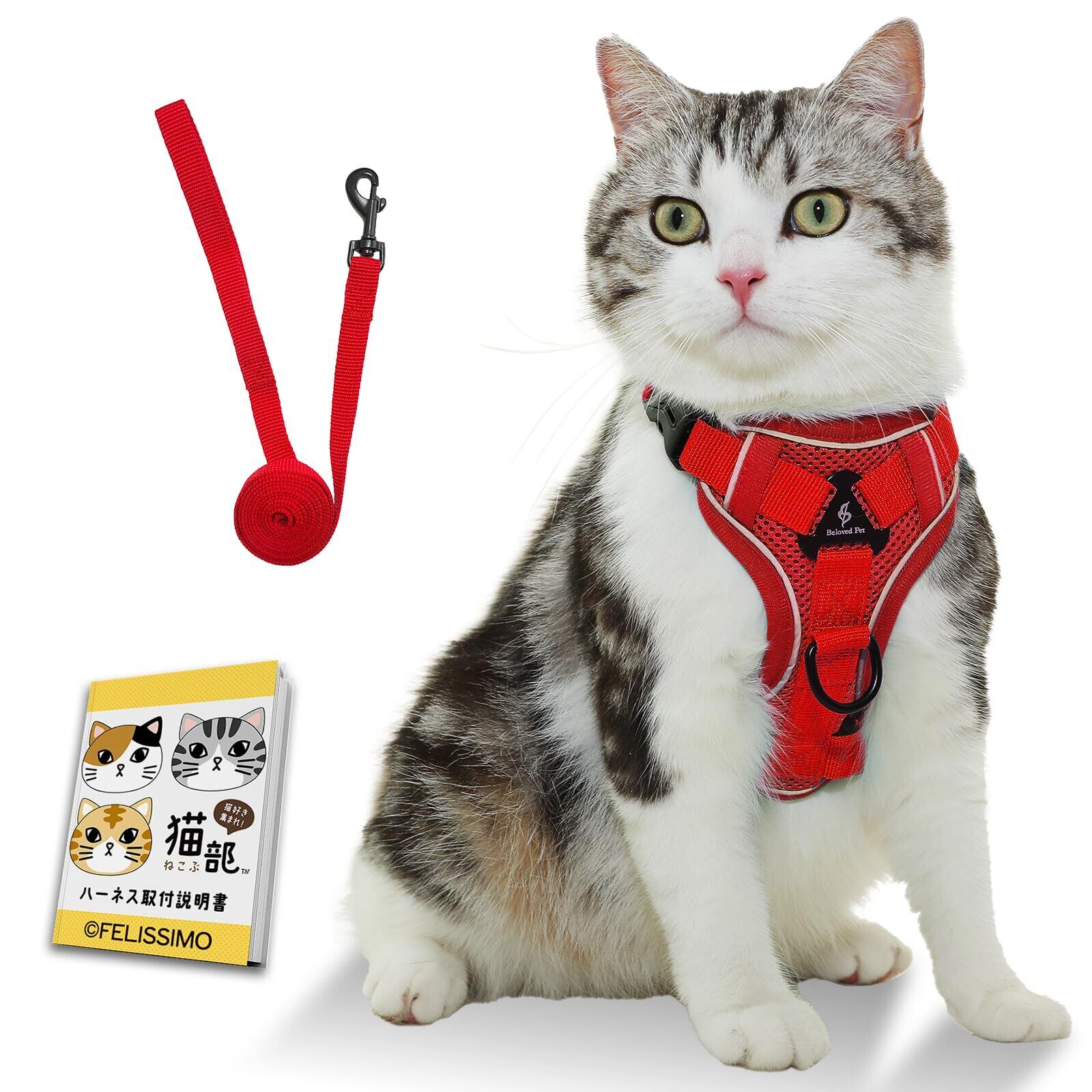 【大手雑誌で紹介】フェリシモ 猫部 猫 専用 ハーネス 首輪感覚で簡単装着 足を上げず装着 防災 災害 避難 超軽量 柔らか素材 首輪 胴輪 反射材 (Mサイズ、レッド)
