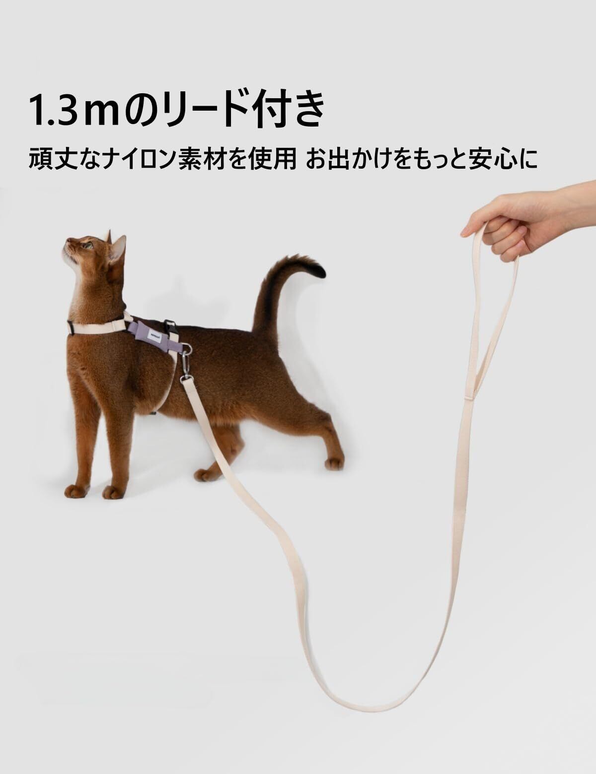 「Lucky Friends ダブルロック猫ハーネス」は、ペットの安全性と快適性を追求した、軽量でおしゃれなデザインのハーネスです。首回りや胴回りの調整が簡単で、愛猫の体型にピッタリフィット。リード部分も130cmの十分な長さがあり、思いっきり遊ぶ時間をサポートします。