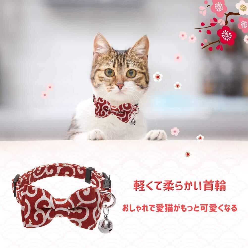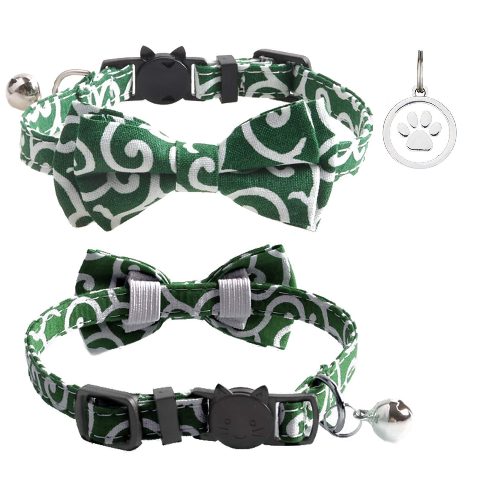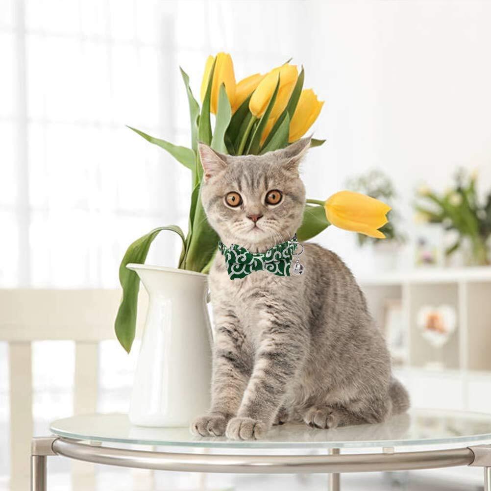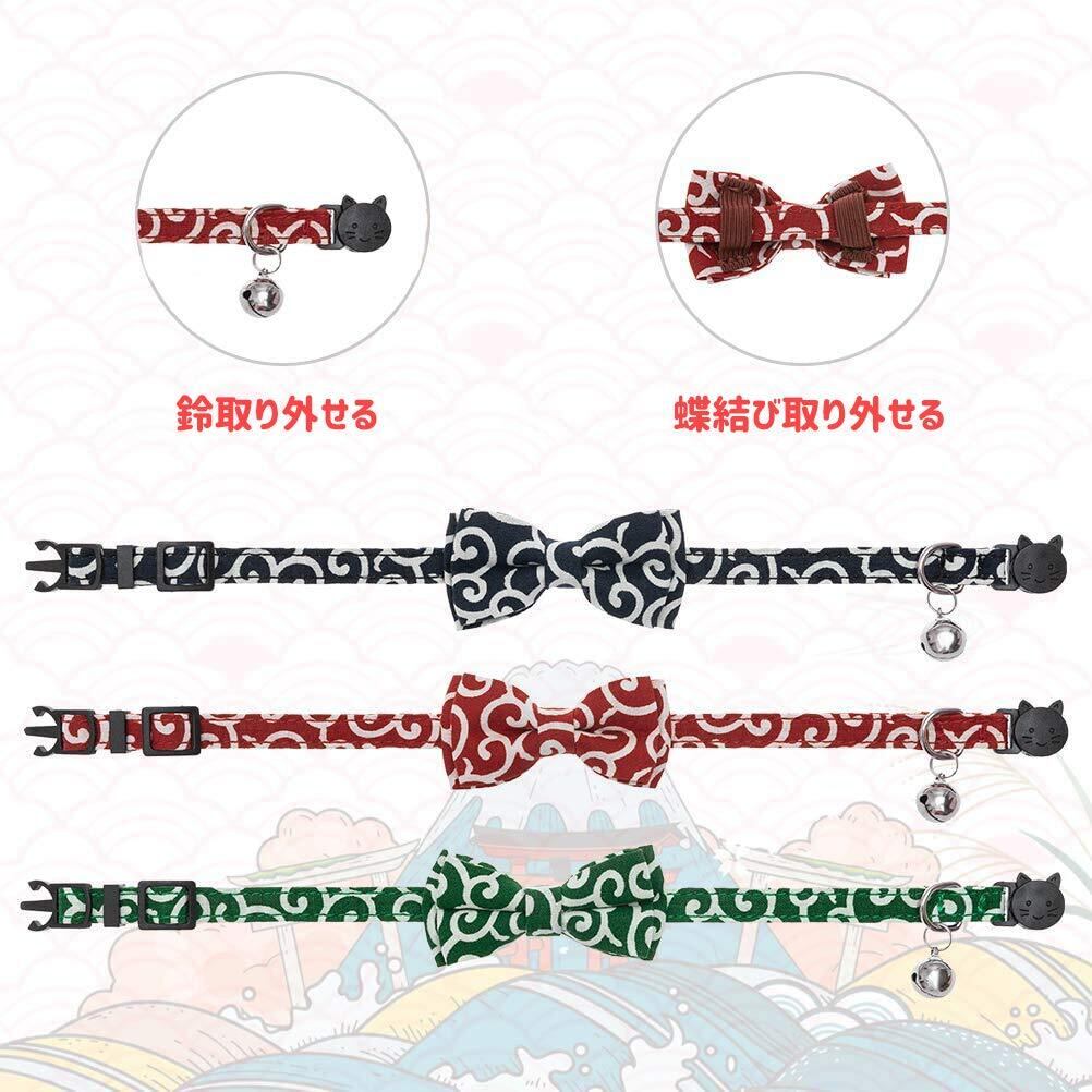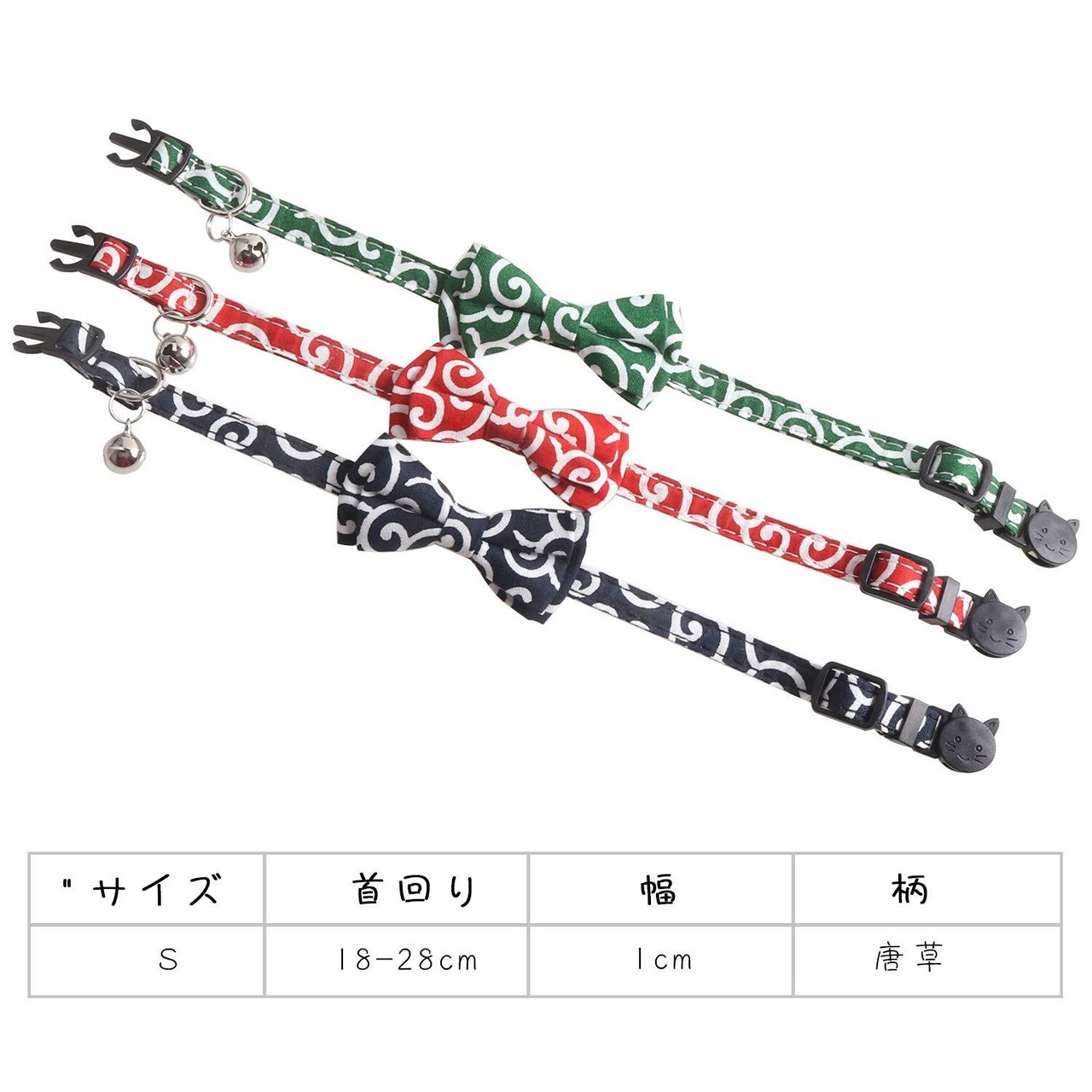 猫首輪 猫用 首輪 子犬 迷子札付き リボン付き 鈴付き 蝶結び付き 調整可能 可愛い 軽量 ペット首輪 セーフティバックル付 布 和風 唐草 グリーン 1個入り