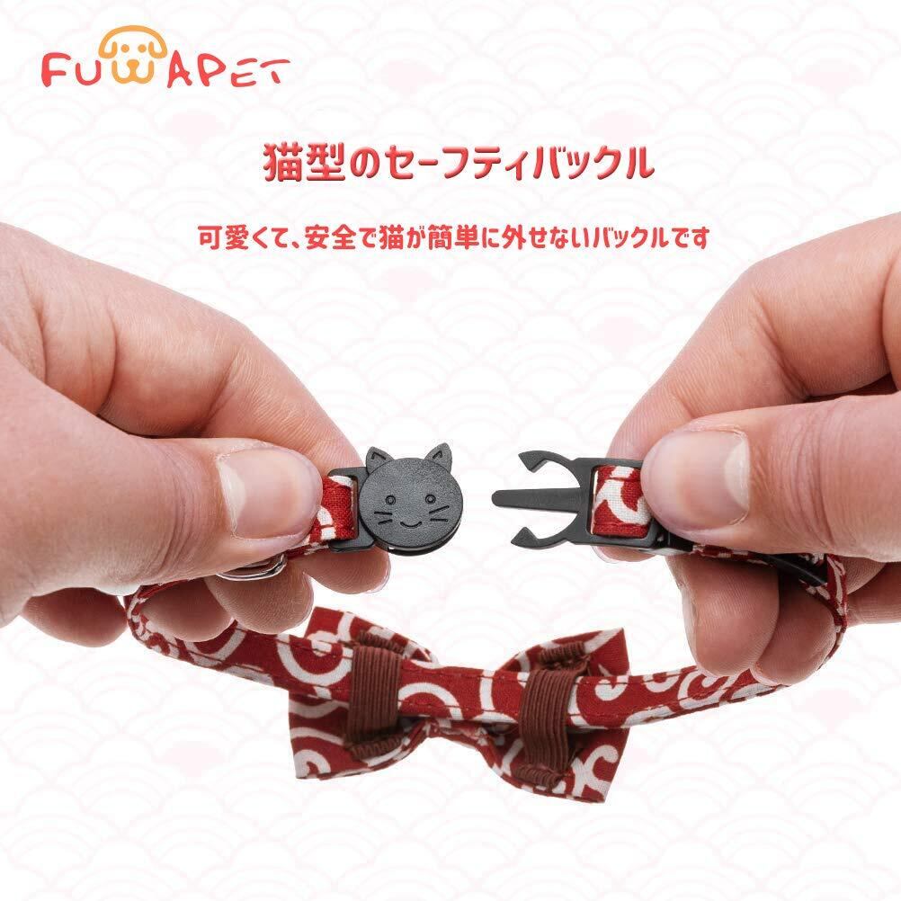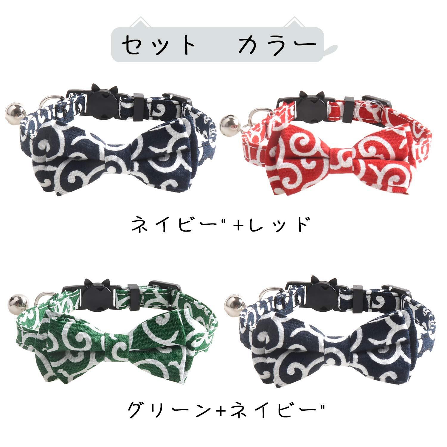【素材とカラー】素材は耐久性のある布生地で柔らかくとても軽いから、猫ちゃんに優しいです、柄は唐草でオシャレで可愛いです。カラー:ネイビー、レッド、グリーン。パッキングリスト:グリーン猫首輪1個、迷子札1個、FUWAPETブランドタグ