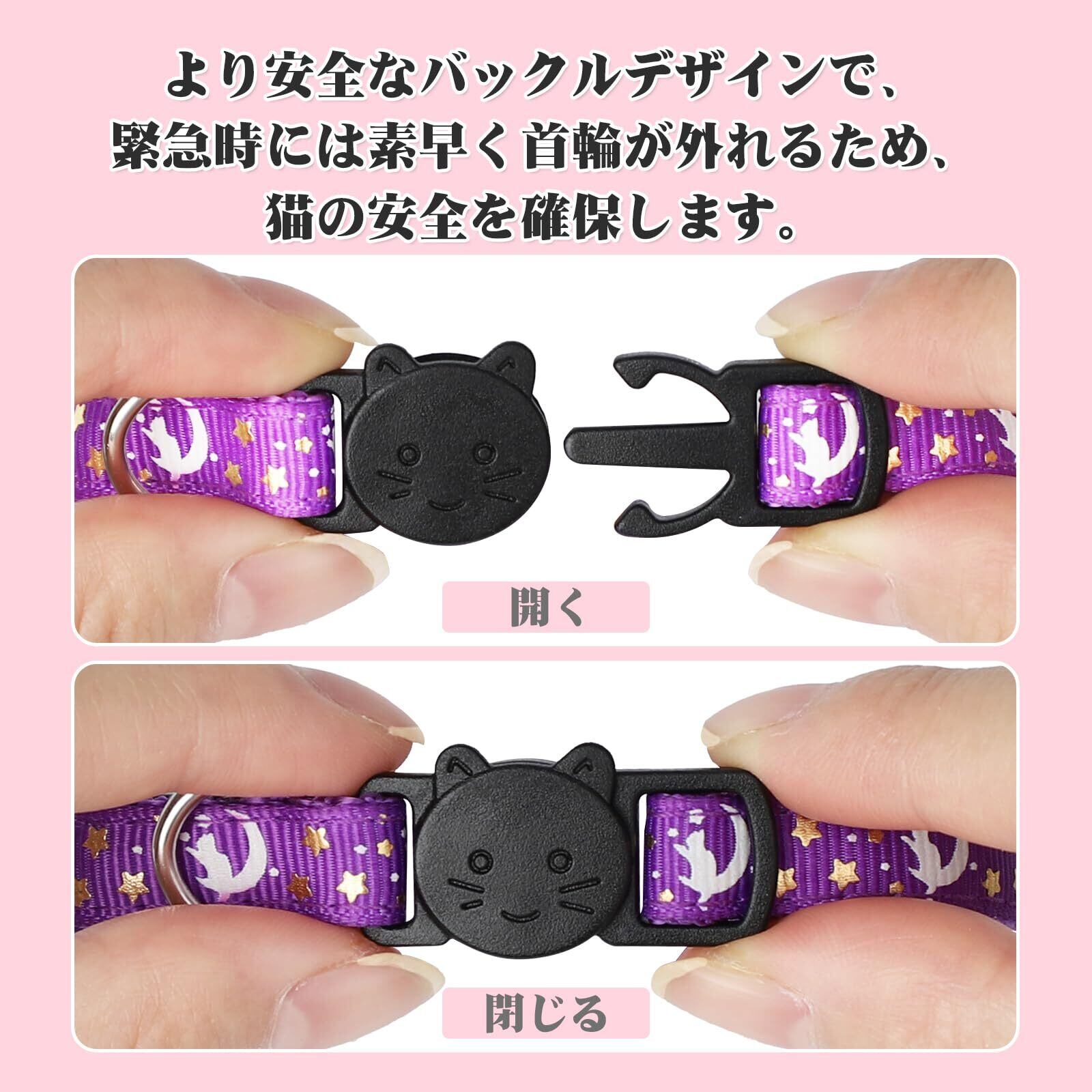 【より安全なバックルデザイン】猫用首輪は安全バックルを採用しており、一定の力が加わると首輪が外れる仕組みです。ペットが外出中や脱走時に枝やコードに引っかかっても、簡単に外せるため、猫の安全を確保します。