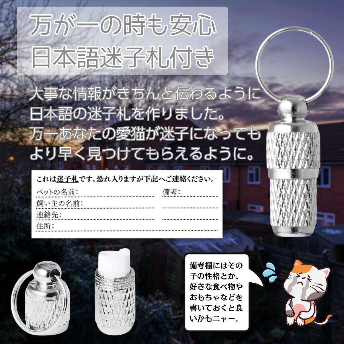 【日本語迷子札付き】 各首輪セットには日本語の迷子札が付属されており、飼い主の名前や連絡先を日本語で記入・表示することができます。 万が一の時に、迷子になった猫が素早く発見され、また見つけた方へしっかりと情報が伝わるように、日本語迷子札を独自に制作致しました。無事に帰宅できる可能性が高まります。 また、手書きの迷子札は中身が見えないため、飼い主様の個人情報が守られるのは大きなメリットです。